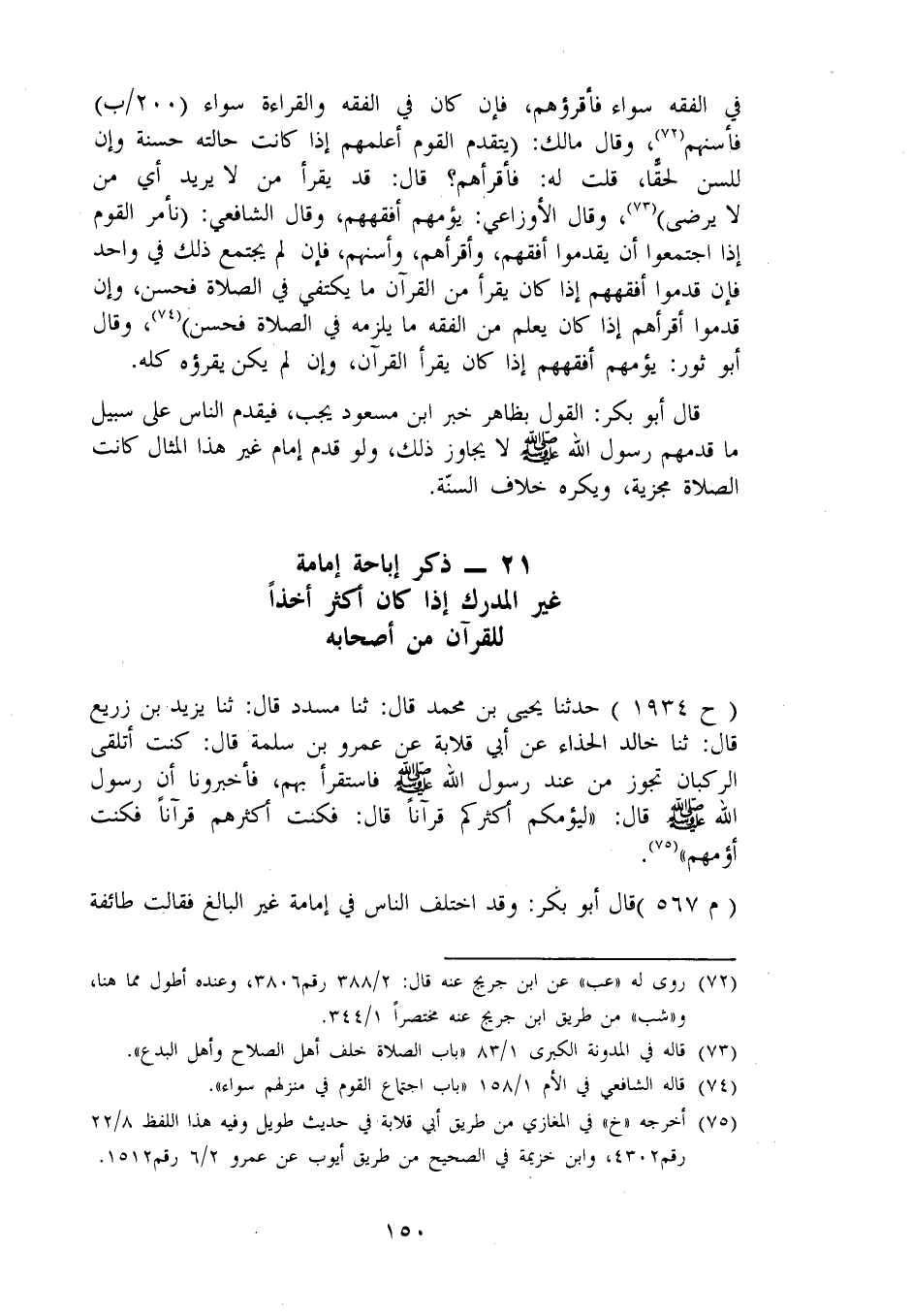 1934 - حَدَّثَنَا يَحْيَى بْنُ مُحَمَّدٍ، قَالَ: ثنا مُسَدَّدٌ، قَالَ: ثنا يَزِيدُ بْنُ زُرَيْعٍ، قَالَ: ثنا خَالِدٌ الْحَذَّاءُ، عَنْ أَبِي قِلَابَةَ، عَنْ عَمْرِو بْنِ سَلَمَةَ، قَالَ: كُنْتُ أَتَلَقَّى الرُّكْبَانَ تَجُوزُ مِنْ عِنْدِ رَسُولِ اللهِ صَلَّى اللَّهُ عَلَيْهِ وَسَلَّمَ فَأَسْتَقْرِئُ بِهِمْ، فَأَخْبَرُونَا أَنَّ رَسُولَ اللهِ صَلَّى اللَّهُ عَلَيْهِ وَسَلَّمَ قَالَ: «لِيَؤُمَّكُمْ أَكْثَرُكُمْ قُرْآنًا» . قَالَ: فَكُنْتُ أَكْثَرَهُمْ قُرْآنًا فَكُنْتُ أَؤُمُّهُمْ قَالَ أَبُو بَكْرٍ: وَقَدِ اخْتَلَفَ النَّاسُ فِي إِمَامَةِ غَيْرِ الْبَالِغِ؛ فَقَالَتْ طَائِفَةٌ -[151]- بِظَاهِرِ حَدِيثِ عَمْرِو بْنِ سَلَمَةَ، وَقَدَّمَ الْأَشْعَثَ غُلَامًا فَقِيلَ لَهُ: فَقَالَ: إِنَّمَا أُقَدِّمُ الْقُرْآنَ وَرُوِّينَا عَنْ عَائِشَةَ أَنَّهَا قَالَتْ: كُنَّا نَأْخُذُ الصِّبْيَانَ مِنَ الْكُتَّابِ فُنُقَدِّمُهُمْ يُصَلُّونَ لَنَا شَهْرَ رَمَضَانَ، وَنَعْمَلُ لَهُمُ الْقَلِيَّةَ وَالْخُشْكَنَانَ