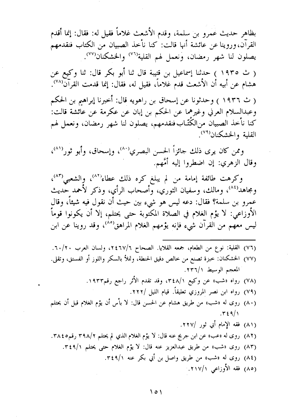1936 - وَحَدَّثُونَا عَنْ إِسْحَاقَ بْنِ رَاهَوَيْهِ، قَالَ: أَخْبَرَنَا إِبْرَاهِيمُ بْنُ الْحَكَمِ، وَعَبْدُ السَّلَامِ الْعُرَنِيُّ وَغَيْرُهُمَا، عَنِ الْحَكَمِ بْنِ أَبَانَ، عَنْ عِكْرِمَةَ، عَنْ عَائِشَةَ، قَالَتْ: كُنَّا نَأْخُذُ الصِّبْيَانَ مِنَ الْكُتَّابِ فَنُقَدِّمُهُمْ، يُصَلُّونَ لَنَا شَهْرَ رَمَضَانَ وَنَعْمَلُ لَهُمُ الْقَلِيَّةَ وَالْخُشْكَنَانَ وَمِمَّنْ كَانَ يَرَى ذَلِكَ جَائِزًا الْحَسَنُ الْبَصْرِيُّ، وَإِسْحَاقُ، وَأَبُو ثَوْرٍ، وَقَالَ الزُّهْرِيُّ: إِنِ اضْطُرُّوا إِلَيْهِ أَمَّهُمْ. وَكَرِهَتْ طَائِفَةٌ إِمَامَةَ مَنْ لَمْ يَبْلُغْ كَرِهَ ذَلِكَ عَطَاءٌ وَالشَّعْبِيُّ وَمُجَاهِدٌ وَمَالِكٌ وَسُفْيَانُ الثَّوْرِيُّ، وَأَصْحَابُ الرَّأْيِ، وَذُكِرَ لِأَحْمَدَ حَدِيثُ عَمْرِو بْنِ سَلَمَةَ؟ فَقَالَ: دَعْهُ لَيْسَ هُوَ شَيْءٌ بَيِّنٌ حَيْثُ أَنْ نَقُولَ فِيهِ شَيْئًا وَقَالَ الْأَوْزَاعِيُّ: لَا يَؤُمُّ الْغُلَامُ فِي الصَّلَاةِ الْمَكْتُوبَةِ حَتَّى يَحْتَلِمَ، إِلَّا أَنْ يَكُونُوا قَوْمًا لَيْسَ مَعَهُمْ مِنَ الْقُرْآنِ شَيْءٌ فَإِنَّهُ يَؤُمُّهُمُ الْغُلَامُ الْمُرَاهِقُ. وَقَدْ رُوِّينَا عَنِ ابْنِ -[152]- عَبَّاسٍ أَنَّهُ قَالَ: لَا يَؤُمُّ الْغُلَامُ حَتَّى يَحْتَلِمَ