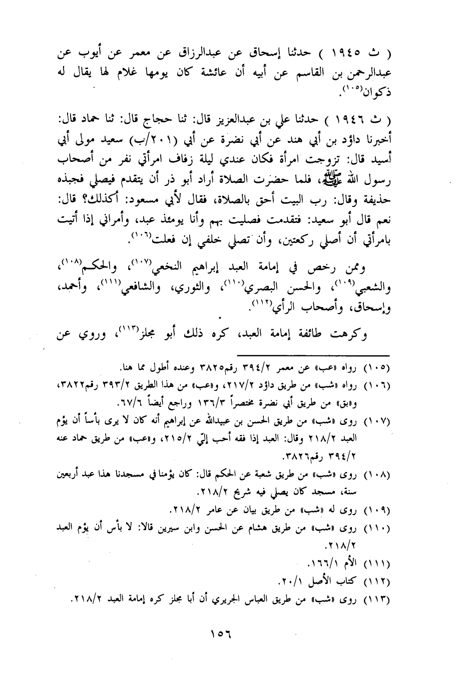 1946 - حَدَّثَنَا عَلِيُّ بْنُ عَبْدِ الْعَزِيزِ، قَالَ: ثنا حَجَّاجٌ، ثنا حَمَّادٌ، قَالَ: أَخْبَرَنَا دَاوُدُ بْنُ أَبِي هِنْدَ، عَنْ أَبِي نَضْرَةَ، عَنْ أَبِي سَعِيدٍ مَوْلَى أَبِي أُسَيْدٍ قَالَ: تَزَوَّجْتُ امْرَأَةً فَكَانَ عِنْدِي لَيْلَةَ زِفَافِ امْرَأَتِي نَفَرٌ مِنْ أَصْحَابِ رَسُولِ اللهِ صَلَّى اللَّهُ عَلَيْهِ وَسَلَّمَ، فَلَمَّا حَضَرَتِ الصَّلَاةُ أَرَادَ أَبُو ذَرٍّ أَنْ يَتَقَدَّمَ فَيُصَلِّيَ فَجَبَذَهُ حُذَيْفَةُ وَقَالَ: رَبُّ الْبَيْتِ أَحَقُّ بِالصَّلَاةِ. فَقَالَ لِأَبِي مَسْعُودٍ: أَكَذَلِكَ؟ قَالَ: نَعَمْ. قَالَ أَبُو سَعِيدٍ: فَتَقَدَّمْتُ فَصَلَّيْتُ بِهِمْ وَأَنَا يَوْمَئِذٍ عَبْدٌ، وَأَمَرَانِي إِذَا أَتَيْتُ بِامْرَأَتِي أَنْ أُصَلِّيَ رَكْعَتَيْنِ، وَأَنْ تُصَلِّيَ خَلْفِي إِنْ فَعَلَتْ وَمِمَّنْ رَخَّصَ فِي إِمَامَةِ الْعَبْدِ إِبْرَاهِيمُ النَّخَعِيُّ، وَالْحَكَمُ، وَالشَّعْبِيُّ، وَالْحَسَنُ الْبَصْرِيُّ، وَالثَّوْرِيُّ، وَالشَّافِعِيُّ، وَأَحْمَدُ، وَإِسْحَاقُ، وَأَصْحَابُ الرَّأْيِ. وَكَرِهَتْ طَائِفَةٌ إِمَامَةَ الْعَبْدِ، وَكَرِهَ ذَلِكَ أَبُو مِجْلَزٍ، وَرُوِيَ عَنِ -[157]- الضَّحَّاكِ أَنَّهُ قَالَ: لَا يَؤُمُّ الْمَمْلُوكُ وَفِيهِمْ حُرٌّ وَقَالَ مَالِكٌ: لَا يَؤُمُّهُمْ إِلَّا أَنْ يَكُونَ الْعَبْدُ قَارِئًا وَمَعَهُ مِنَ الْأَحْرَارِ لَا يَقْرَءُونَ، فَيَؤُمُّهُمْ فِي الْمَكَانِ الَّذِي يَلْزَمُهُ أَنْ يَكُونَ فِيهِ إِمَامًا حَتَّى يَحْتَاجَ إِلَيْهِ، إِلَّا أَنْ يَكُونَ فِي عِيدٍ أَوْ جُمُعَةٍ فَإِنَّ الْعَبْدَ لَا يَؤُمُّ فِيهِمَا. وَقَالَ الْأَوْزَاعِيُّ: بَلَغَنَا أَنَّ أَرْبَعَةً لَا يَؤُمُّونَ النَّاسَ فَذَكَرَ الْعَبْدَ إِلَّا أَنْ يَؤُمَّ أَهْلَهُ، وَيُجْزِي عِنْدَ الْأَوْزَاعِيِّ صَلَاتُهُمْ إِنْ صَلَّوْا وَرَاءَهُ. قَالَ أَبُو بَكْرٍ: إِمَامَةُ الْعَبْدِ جَائِزَةٌ، وَإِذَا اسْتَوَوْا فِي الْقِرَاءَةِ فَالْحُرُّ أَحَقُّ بِالْإِمَامَةِ مِنَ الْعَبْدِ، وَإِنْ كَانَ الْعَبْدُ أَقْرَأَ فَهُوَ أَوْلَى بِإِمَامَةٍ لِحَدِيثِ أَبِي سَعِيدٍ
