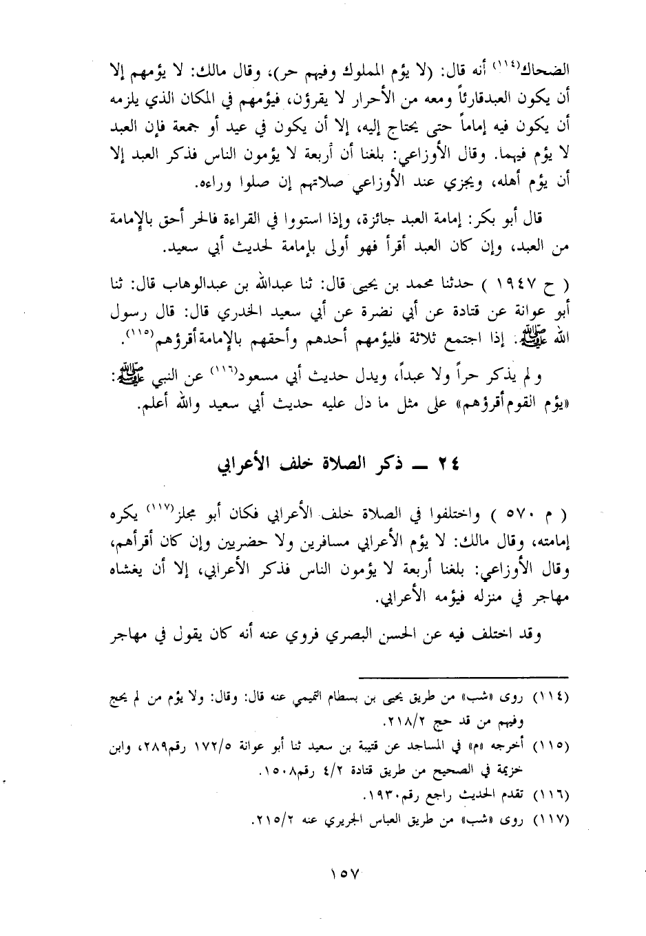 1947 - حَدَّثَنَا مُحَمَّدُ بْنُ يَحْيَى، قَالَ: ثنا عَبْدُ اللهِ بْنُ عَبْدِ الْوَهَّابِ، قَالَ: ثنا أَبُو عَوَانَةَ، عَنْ قَتَادَةَ، عَنْ أَبِي نَضْرَةَ، عَنْ أَبِي سَعِيدٍ الْخُدْرِيِّ، قَالَ: قَالَ رَسُولُ اللهِ صَلَّى اللَّهُ عَلَيْهِ وَسَلَّمَ: «إِذَا اجْتَمَعَ ثَلَاثَةٌ فَلْيَؤُمَّهُمْ أَحَدُهُمْ وَأَحَقُّهُمْ بِالْإِمَامَةِ أَقْرَؤُهُمْ» وَلَمْ يَذْكُرْ حُرًّا وَلَا عَبْدًا، وَيَدُلُّ حَدِيثُ أَبِي مَسْعُودٍ عَنِ النَّبِيِّ صَلَّى اللَّهُ عَلَيْهِ وَسَلَّمَ: «يَؤُمُّ الْقَوْمَ أَقْرَؤُهُمْ» عَلَى مِثْلِ مَا دَلَّ عَلَيْهِ حَدِيثُ أَبِي سَعِيدٍ وَاللهُ أَعْلَمُ