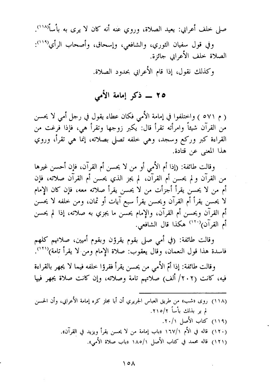 ذِكْرُ إِمَامَةُ الْأُمِّيِّ وَاخْتَلَفُوا فِي إِمَامَةِ الْأُمِّيِّ فَكَانَ عَطَاءٌ يَقُولُ فِي رَجُلٍ أُمِّيٍّ لَا يُحْسِنُ مِنَ الْقُرْآنِ شَيْئًا وَامْرَأَتُهُ تَقْرَأُ قَالَ: يُكَبِّرُ زَوْجُهَا وَتَقْرَأُ هِيَ، فَإِذَا فَرَغَتْ مِنَ الْقِرَاءَةِ كَبَّرَ وَرَكَعَ وَسَجَدَ، وَهِيَ خَلْفَهُ تُصَلِّي بِصَلَاتِهِ، إِنَّمَا هِيَ تَقْرَأُ. وَرُوِيَ هَذَا الْمَعْنَى عَنْ قَتَادَةَ. وَقَالَتْ طَائِفَةٌ: إِذَا أَمَّ الْأُمِّيُّ أَوْ مَنْ لَا يُحْسِنُ أُمَّ الْقُرْآنِ، فَإِنْ أَحْسَنَ غَيْرَهَا مِنَ الْقُرْآنِ وَلَمْ يُحْسِنْ أُمَّ الْقُرْآنِ لَمْ يَجْزِ الَّذِي يُحْسِنُ أُمَّ الْقُرْآنِ صَلَاتُهُ، فَإِنْ أَمَّ مَنْ لَا يُحْسِنُ يَقْرَأُ أَجْزَأَتْ مَنْ لَا يُحْسِنُ يَقْرَأُ صَلَاتُهُ مَعَهُ، فَإِنْ كَانَ الْإِمَامُ لَا يُحْسِنُ يَقْرَأُ أُمَّ الْقُرْآنِ وَيُحْسِنُ يَقْرَأُ سَبْعَ آيَاتٍ أَوْ ثَمَانٍ، وَمَنْ خَلْفَهُ لَا يُحْسِنُ أُمَّ الْقُرْآنِ وَيُحْسِنُ أُمَّ الْقُرْآنِ، وَالْإِمَامُ يُحْسِنُ مَا تَجْزِي بِهِ صَلَاتُهُ، إِذَا لَمْ يُحْسِنْ أُمَّ الْقُرْآنِ، هَكَذَا قَالَ الشَّافِعِيُّ. وَقَالَتْ طَائِفَةٌ فِي أُمِّيٍّ صَلَّى بِقَوْمٍ يَقْرَءُونَ وَبِقَوْمٍ أُمِّيِّينَ صَلَاتُهُمْ كُلُّهُمْ فَاسِدَةٌ، هَذَا قَوْلُ النُّعْمَانِ. وَقَالَ يَعْقُوبُ: صَلَاةُ الْإِمَامِ وَمَنْ لَا يَقْرَأُ تَامَّةٌ. وَقَالَتْ طَائِفَةٌ: إِذَا أَمَّ الْأُمِّيُّ مَنْ يُحْسِنُ يَقْرَأُ فَقَرَءُوا خَلْفَهُ فِيمَا لَا يَجْهَرُ بِالْقِرَاءَةِ فِيهِ، كَانَتْ صَلَاتُهُمْ تَامَّةً وَصَلَاتُهُ، وَإِنْ كَانَتْ صَلَاةٌ يُجْهَرُ فِيهَا