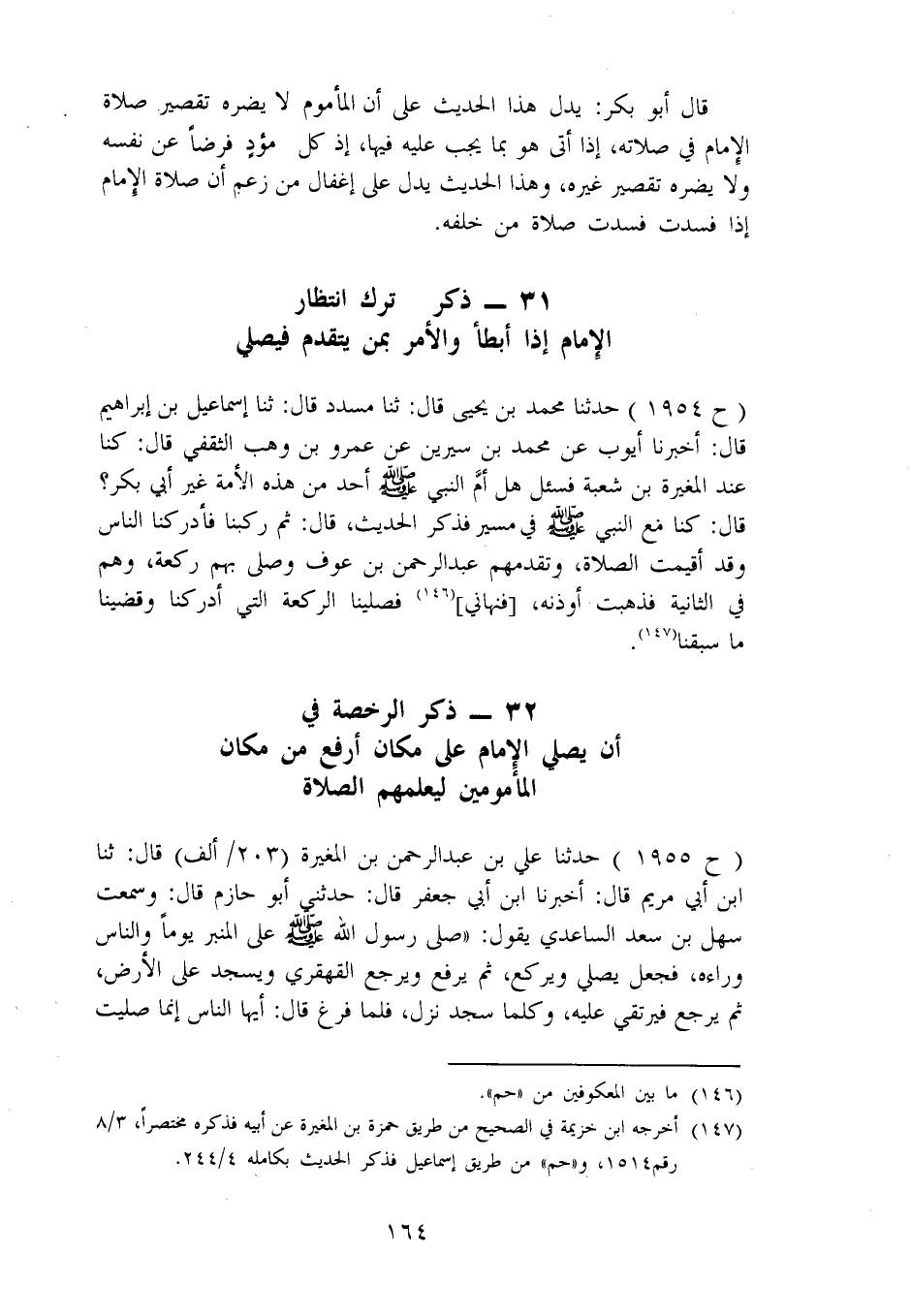 1955 - حَدَّثَنَا عَلِيُّ بْنُ عَبْدِ الرَّحْمَنِ بْنِ الْمُغِيرَةِ، قَالَ: ثنا ابْنُ أَبِي مَرْيَمَ، قَالَ: أَخْبَرَنَا ابْنُ أَبِي جَعْفَرٍ، قَالَ: حَدَّثَنِي أَبُو حَازِمٍ، قَالَ: وَسَمِعْتُ سَهْلَ بْنَ سَعْدٍ السَّاعِدِيَّ، يَقُولُ: صَلَّى رَسُولُ اللهِ صَلَّى اللَّهُ عَلَيْهِ وَسَلَّمَ عَلَى الْمِنْبَرِ يَوْمًا وَالنَّاسُ وَرَاءَهُ، فجَعَلَ يُصَلَّى وَيَرْكَعُ، ثُمَّ يَرْفَعُ وَيَرْجَعُ الْقَهْقَرَى وَيَسْجُدُ عَلَى الْأَرْضِ، ثُمَّ يَرْجِعُ فَيَرْتَقِي عَلَيْهِ وَكُلَّمَا سَجَدَ نَزَلَ، فَلَمَّا فَرَغَ قَالَ: «أَيُّهَا النَّاسُ، إِنَّمَا صَلَّيْتُ -[165]- بِكُمْ هَكَذَا كَيْمَا تَرَوْنِي فَتَأْتَمُّوا بِي» قَالَ أَبُو بَكْرٍ: هَكَذَا يَفْعَلُ الْإِمَامُ إِذَا أَرَادَ أَنْ يُعَلِّمَهُمْ، فَإِنْ لَمْ يَكُنْ كَذَلِكَ وَلَمْ يَرُدْ يُعَلِّمُهُمْ فَمَكْرُوهٌ أَنْ يُصَلِّيَ عَلَى مَكَانٍ أَرْفَعَ مِنْ مَكَانِ الْمَأْمُومِينَ يَدُلُّ عَلَى ذَلِكَ حَدِيثُ الْمَأْمُومِينَ