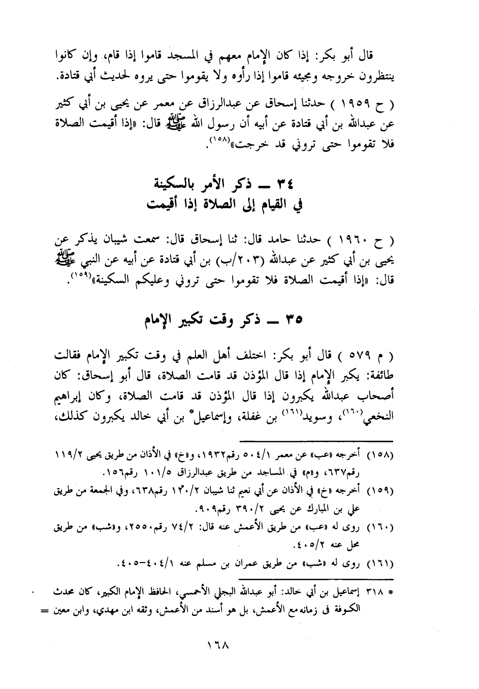 1960 - حَدَّثَنَا حَامِدٌ، قَالَ: ثنا إِسْحَاقُ، قَالَ: سَمِعْتُ شَيْبَانَ، يَذْكُرُ عَنْ يَحْيَى بْنِ أَبِي كَثِيرٍ، عَنْ عَبْدِ اللهِ بْنِ أَبِي قَتَادَةَ، عَنْ أَبِيهِ، عَنِ النَّبِيِّ صَلَّى اللَّهُ عَلَيْهِ وَسَلَّمَ قَالَ: «إِذَا أُقِيمَتِ الصَّلَاةُ فَلَا تَقُومُوا حَتَّى تَرَوْنِي، وَعَلَيْكُمُ السَّكِينَةُ»