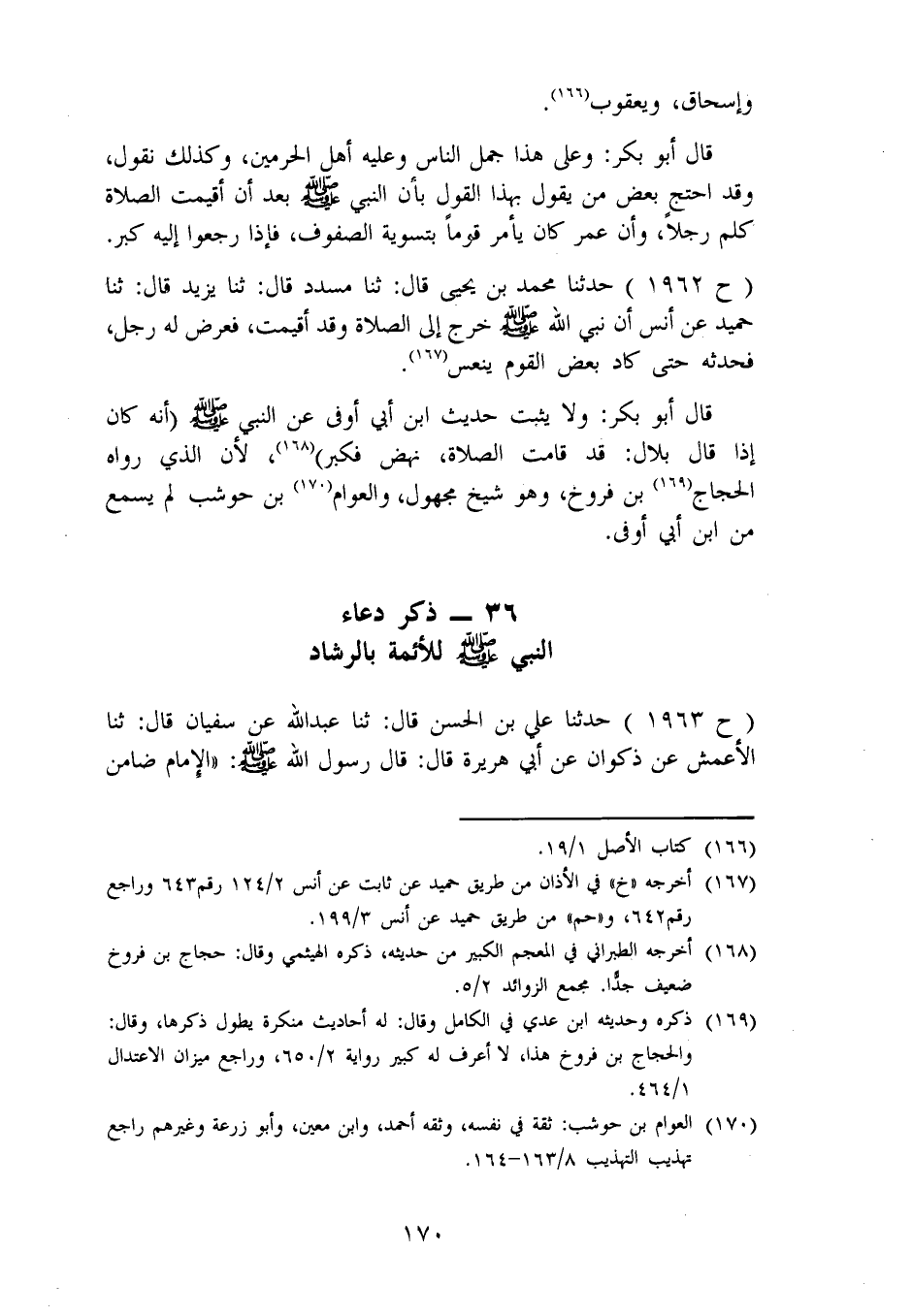 1962 - حَدَّثَنَا مُحَمَّدُ بْنُ يَحْيَى، قَالَ: ثنا مُسَدَّدٌ، قَالَ: ثنا يَزِيدُ، قَالَ: ثنا حُمَيْدٌ، عَنْ أَنَسٍ، أَنَّ نَبِيَّ اللهِ صَلَّى اللَّهُ عَلَيْهِ وَسَلَّمَ خَرَجَ إِلَى الصَّلَاةِ وَقَدِ أُقِيمَتْ، فَعَرَضَ لَهُ رَجُلٌ، فَحَدَّثَهُ حَتَّى كَادَ بَعْضُ الْقَوْمِ يَنْعُسُ قَالَ أَبُو بَكْرٍ: وَلَا يُثْبَتُ حَدِيثُ ابْنِ أَبِي أَوَفِي، عَنِ النَّبِيِّ صَلَّى اللَّهُ عَلَيْهِ وَسَلَّمَ أَنَّهُ كَانَ إِذَا قَالَ بِلَالٌ: قَدْ قَامَتِ الصَّلَاةُ. نَهَضَ فَكَبَّرَ، لِأَنَّ الَّذِي رَوَاهُ الْحَجَّاجُ بْنُ فَرُّوخَ، وَهُوَ شَيْخٌ مَجْهُولٌ، وَالْعَوَّامُ بْنُ حَوْشَبٍ لَمْ يَسْمَعْ مِنِ ابْنِ أَبِي أَوْفَى