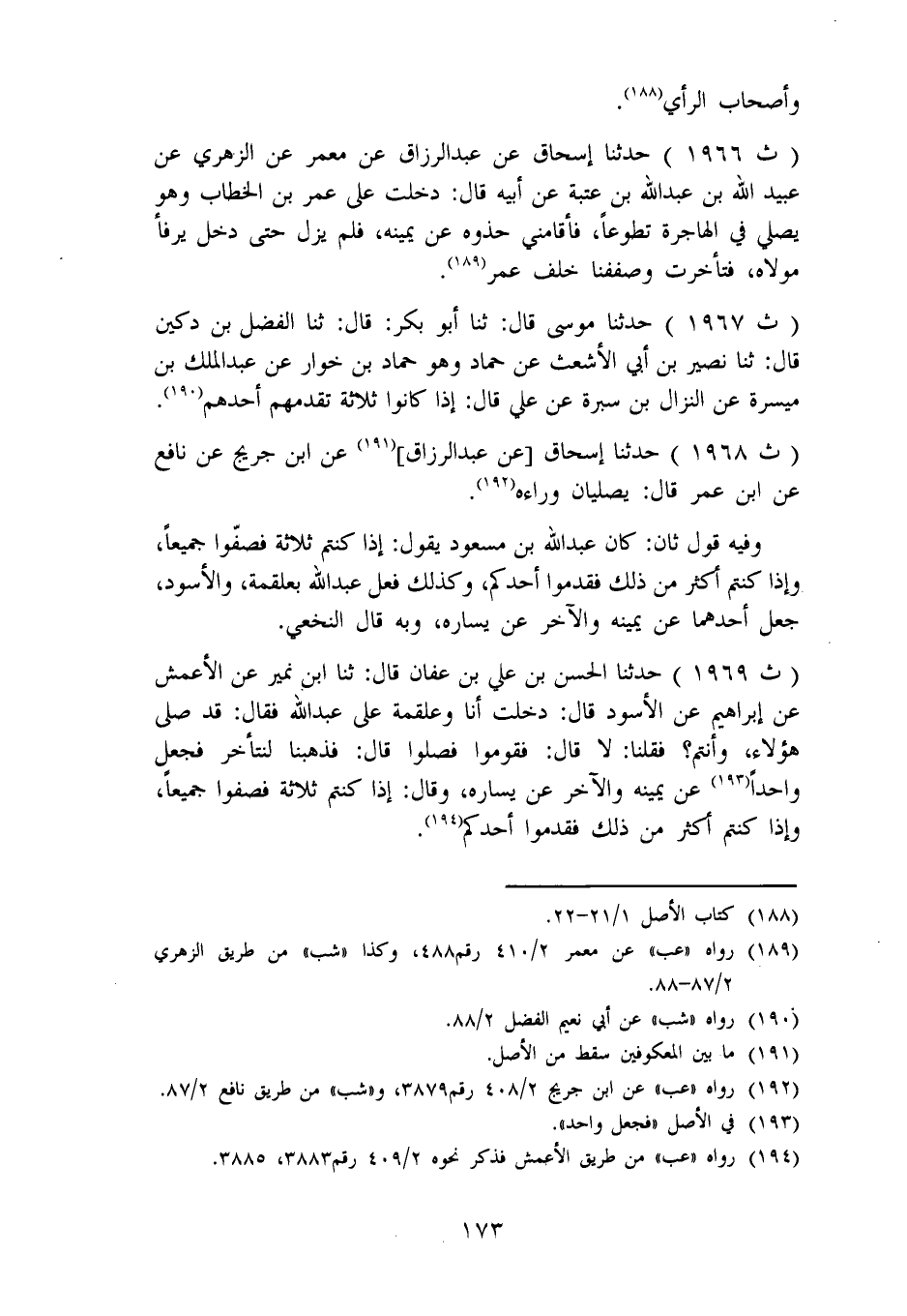 1968 - حَدَّثَنَا إِسْحَاقُ، عَنْ عَبْدِ الرَّزَّاقِ، عَنِ ابْنِ جُرَيْجٍ، عَنْ نَافِعٍ، عَنِ ابْنِ عُمَرَ، قَالَ: «يُصَلِّيَانِ وَرَاءَهُ» . وَفِيهِ قَوْلٌ ثانٍ: كَانَ عَبْدُ اللهِ بْنُ مَسْعُودٍ يَقُولُ: إِذَا كُنْتُمْ ثَلَاثَةً فَصُفُّوا جَمِيعًا وَإِذَا كُنْتُمْ أَكْثَرَ مِنْ ذَلِكَ فَقَدِّمُوا أَحَدَكُمْ , وَكَذَلِكَ فَعَلَ عَبْدُ اللهِ بِعَلْقَمَةَ، وَالْأَسْوَدِ، جَعَلَ أَحَدَهُمَا عَنْ يَمِينِهِ وَالْآخَرَ عَنْ يَسَارِهِ، وَبِهِ قَالَ النَّخَعِيُّ