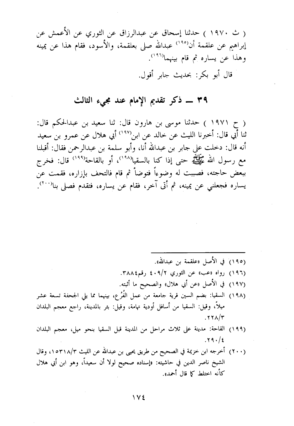 1970 - حَدَّثَنَا إِسْحَاقُ، عَنْ عَبْدِ الرَّزَّاقِ، عَنِ الثَّوْرِيِّ، عَنِ الْأَعْمَشِ، عَنْ إِبْرَاهِيمَ، عَنْ عَلْقَمَةَ، أَنَّ عَبْدَ اللهِ، صَلَّى بِعَلْقَمَةَ وَالْأَسْوَدِ، فَقَامَ هَذَا عَنْ يَمِينِهِ وَهَذَا عَنْ يَسَارِهِ ثُمَّ قَامَ بَيْنَهُمَا قَالَ أَبُو بَكْرٍ: بِحَدِيثِ جَابِرٍ أَقُولُ