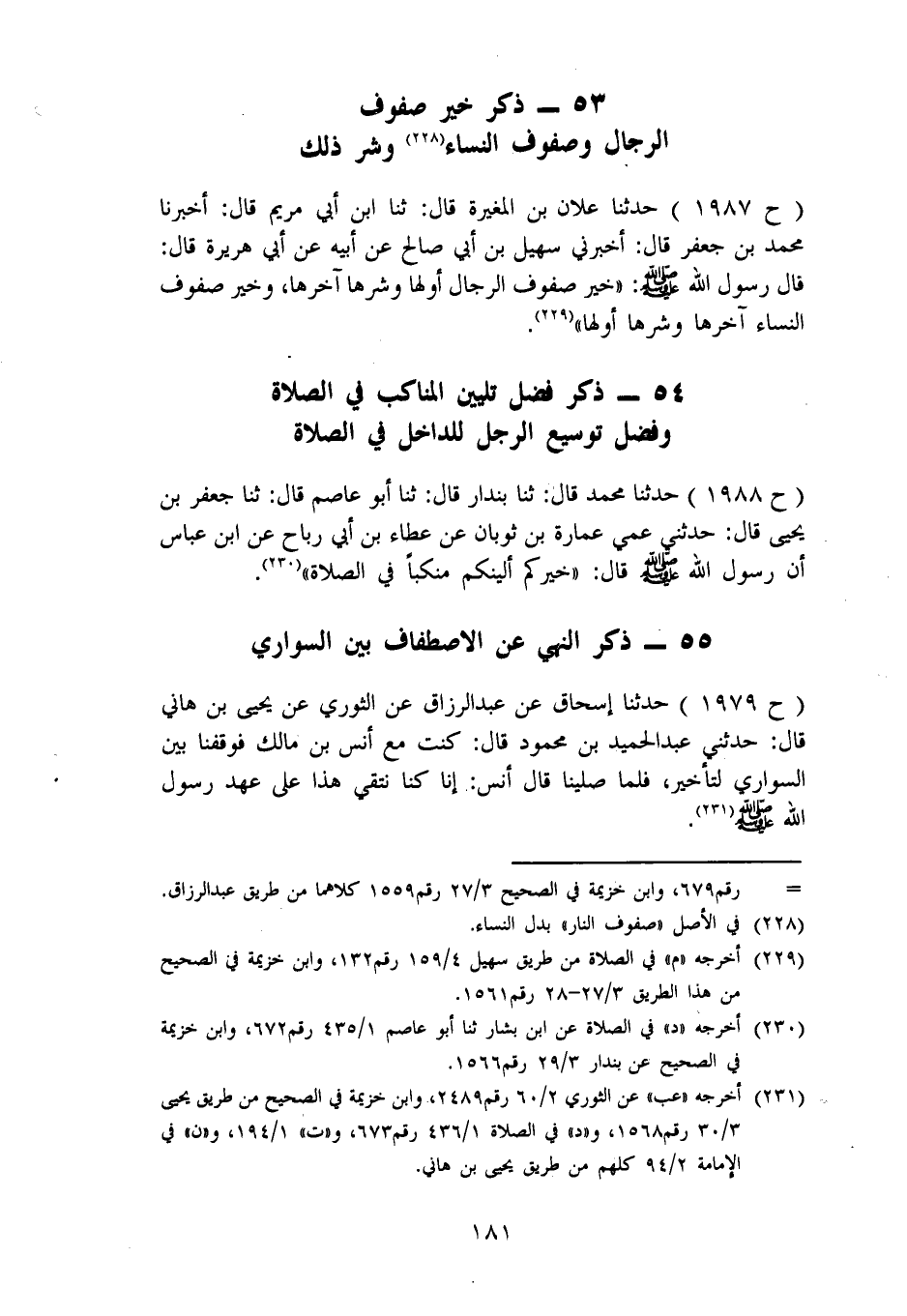1987 - حَدَّثَنَا عَلَّانُ بْنُ الْمُغِيرَةِ، قَالَ: ثنا ابْنُ أَبِي مَرْيَمَ، قَالَ: أَخْبَرَنَا مُحَمَّدُ بْنُ جَعْفَرٍ، قَالَ: أَخْبَرَنِي سُهَيْلُ بْنُ أَبِي صَالِحٍ، عَنْ أَبِيهِ، عَنْ أَبِي هُرَيْرَةَ، قَالَ: قَالَ رَسُولُ اللهِ صَلَّى اللَّهُ عَلَيْهِ وَسَلَّمَ: «خَيْرُ صُفُوفِ الرِّجَالِ أَوَّلُهَا وَشَرُّهَا آخِرُهَا، وَخَيْرُ صُفُوفِ النِّسَاءِ آخِرُهَا وَشَرُّهَا أَوَّلُهَا»