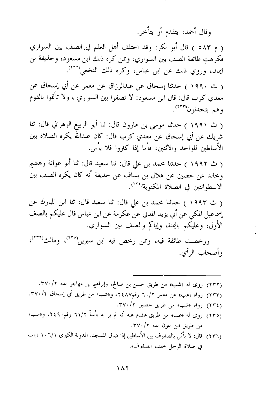1991 - حَدَّثَنَا مُوسَى بْنُ هَارُونَ، قَالَ: ثنا أَبُو الرَّبِيعِ الزَّهْرَانِيُّ، قَالَ: ثنا شَرِيكٌ، عَنْ أَبِي إِسْحَاقَ، عَنْ مَعْدِي كَرِبَ قَالَ: كَانَ عَبْدُ اللهِ يَكْرَهُ الصَّلَاةَ بَيْنَ الْأَسَاطِينِ لِلْوَاحِدِ وَالِاثْنَيْنِ، فَأَمَّا إِذَا كَثُرُوا فَلَا بَأْسَ