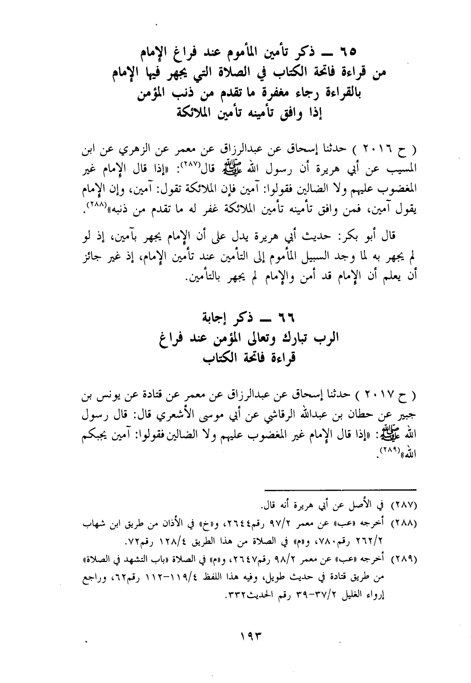 2016 - حَدَّثَنَا إِسْحَاقُ، عَنْ عَبْدِ الرَّزَّاقِ، عَنْ مَعْمَرٍ، عَنِ الزُّهْرِيِّ، عَنِ ابْنِ الْمُسَيِّبِ، عَنْ أَبِي هُرَيْرَةَ، أَنَّ رَسُولَ اللهِ صَلَّى اللَّهُ عَلَيْهِ وَسَلَّمَ قَالَ: " إِذَا قَالَ الْإِمَامُ {غَيْرِ الْمَغْضُوبِ عَلَيْهِمْ وَلَا الضَّالِّينَ} [الفاتحة: 7] فَقُولُوا: آمِينَ؛ فَإِنَّ الْمَلَائِكَةَ تَقُولُ: آمِينَ، وَإِنَّ الْإِمَامَ يَقُولُ: آمِينَ، فَمَنْ وَافَقَ تَأْمِينُهُ تَأْمِينَ الْمَلَائِكَةِ غُفِرَ لَهُ مَا تَقَدَّمَ مِنْ ذَنْبِهِ ". قَالَ أَبُو بَكْرٍ: حَدِيثُ أَبِي هُرَيْرَةَ يَدُلُّ عَلَى أَنَّ الْإِمَامَ يَجْهَرُ بِآمِينَ، إِذْ لَوْ لَمْ يَجْهَرْ بِهِ لَمَا وَجَدَ السَّبِيلَ الْمَأْمُومُ إِلَى التَّأْمِينِ عِنْدَ تَأْمِينِ الْإِمَامِ، إِذْ غَيْرُ جَائِزٍ أَنْ يَعْلَمَ أَنَّ الْإِمَامَ قَدْ أَمَّنَ وَالْإِمَامُ لَمْ يَجْهَرْ بِالتَّأْمِينِ