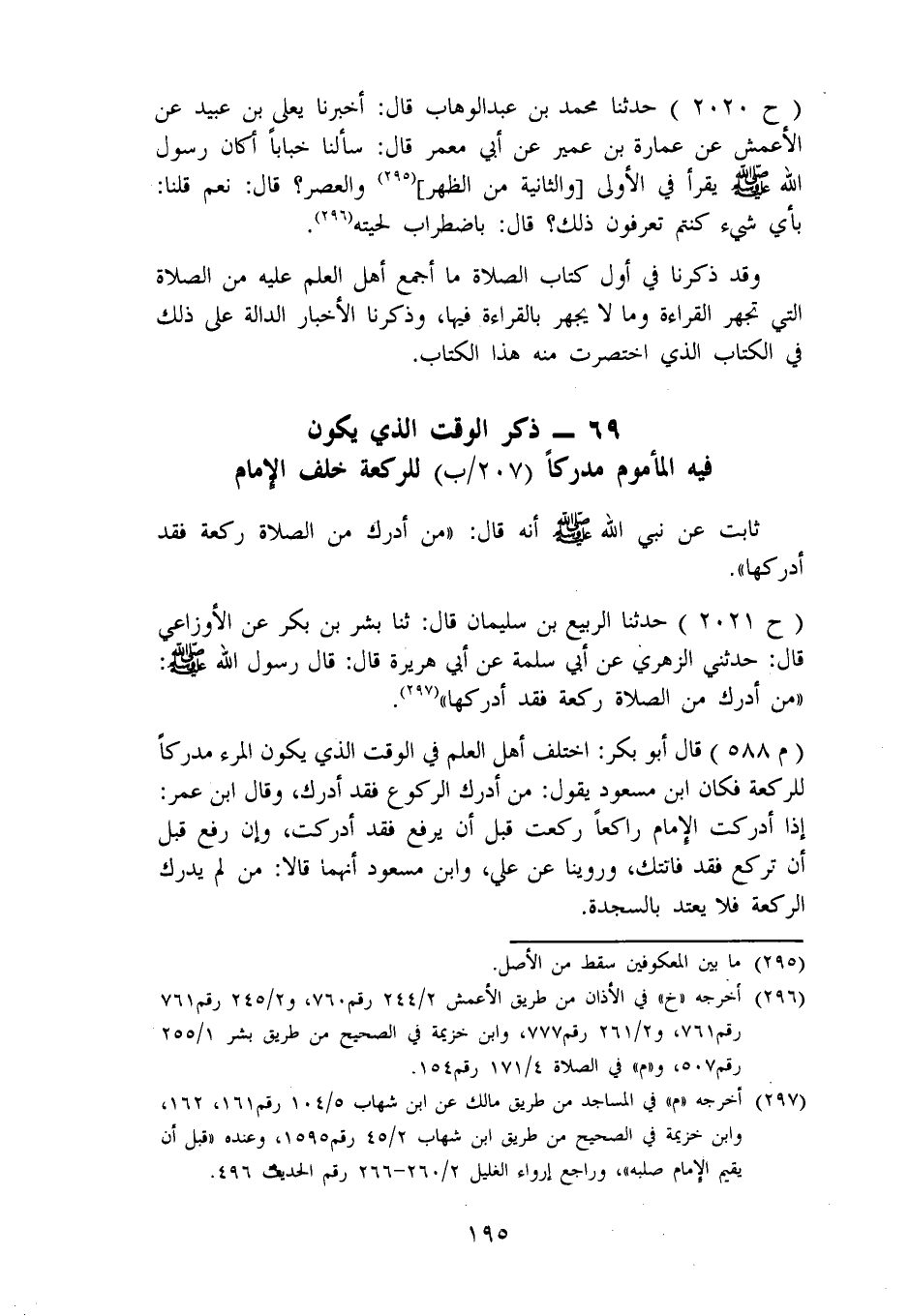 ذِكْرُ الْوَقْتِ الَّذِي يَكُونُ فِيهِ الْمَأْمُومُ مُدْرِكًا لِلرَّكْعَةِ خَلْفَ الْإِمَامِ ثَابِتٌ عَنْ نَبِيِّ اللهِ صَلَّى اللَّهُ عَلَيْهِ وَسَلَّمَ أَنَّهُ قَالَ: «مَنْ أَدْرَكَ مِنَ الصَّلَاةِ رَكْعَةً فَقَدْ أَدْرَكَهَا»