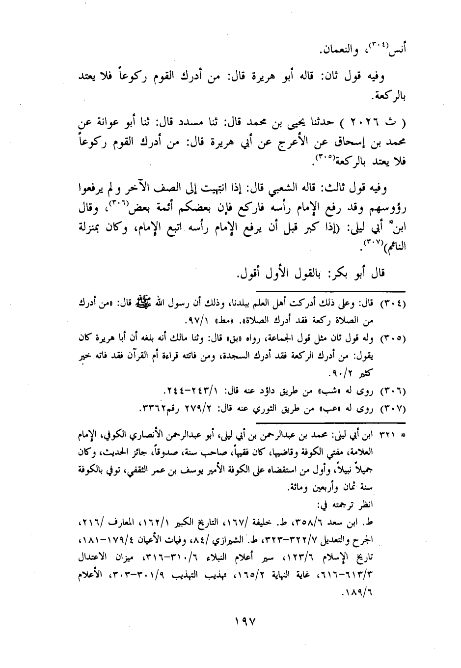 2026 - حَدَّثَنَا يَحْيَى بْنُ مُحَمَّدٍ، قَالَ: ثنا مُسَدَّدٌ، قَالَ: ثنا أَبُو عَوَانَةَ، عَنْ مُحَمَّدِ بْنِ إِسْحَاقَ، عَنِ الْأَعْرَجِ، عَنْ أَبِي هُرَيْرَةَ، قَالَ: «مَنْ أَدْرَكَ الْقَوْمَ رُكُوعًا فَلَا يَعْتَدَّ بِالرَّكْعَةِ» وَفِيهِ قَوْلٌ ثَالِثٌ قَالَهُ الشَّعْبِيُّ قَالَ: إِذَا انْتَهَيْتَ إِلَى الصَّفِّ الْآخِرِ وَلَمْ يَرْفَعُوا رُءُوسَهُمْ وَقَدْ رَفَعَ الْإِمَامُ رَأْسَهُ فَارْكَعْ فَإِنَّ بَعْضَكُمْ أَئِمَّةُ بَعْضٍ، وَقَالَ ابْنُ أَبِي لَيْلَى: إِذَا كَبَّرَ قَبْلَ أَنْ يَرْفَعَ الْإِمَامُ رَأْسَهُ اتَّبَعَ الْإِمَامَ، وَكَانَ بِمَنْزِلِهِ النَّائِمِ. قَالَ أَبُو بَكْرٍ: بِالْقَوْلِ الْأَوَّلِ أَقُولُ