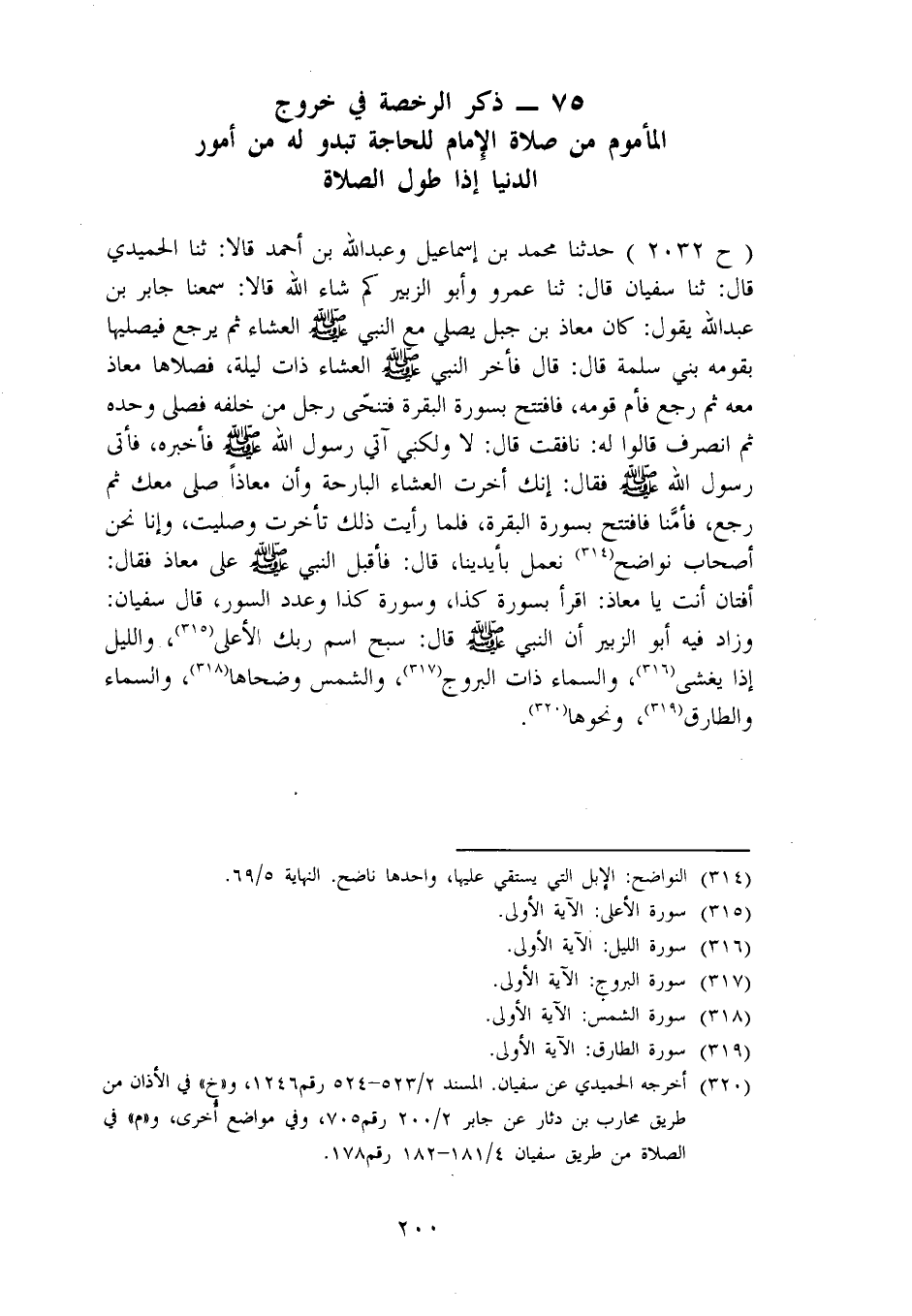 2032 - حَدَّثَنَا مُحَمَّدُ بْنُ إِسْمَاعِيلَ، وَعَبْدُ اللهِ بْنُ أَحْمَدَ، قَالَا: ثنا الْحُمَيْدِيُّ، قَالَ: ثنا سُفْيَانُ، قَالَ: ثنا عَمْرٌو، وَأَبُو الزُّبَيْرِ، كَمْ شَاءَ اللهُ قَالَا: سَمِعْنَا جَابِرَ بْنَ عَبْدِ اللهِ، يَقُولُ: كَانَ مُعَاذُ بْنُ جَبَلٍ يُصَلِّي مَعَ النَّبِيِّ صَلَّى اللَّهُ عَلَيْهِ وَسَلَّمَ الْعِشَاءَ ثُمَّ يَرْجِعُ فَيُصَلِّيهَا بِقَوْمِهِ بَنِي سَلَمَةَ، قَالَ: فَأَخَّرَ النَّبِيُّ صَلَّى اللَّهُ عَلَيْهِ وَسَلَّمَ الْعِشَاءَ ذَاتَ لَيْلَةٍ، فَصَلَّاهَا مُعَاذٌ مَعَهُ ثُمَّ رَجَعَ فَأَمَّ قَوْمَهُ، فَافْتَتَحَ بِسُورَةِ الْبَقَرَةِ فَتَنَحَّى رَجُلٌ مِنْ خَلْفِهِ فَصَلَّى وَحْدَهُ ثُمَّ انْصَرَفَ، قَالُوا لَهُ: نَافَقْتَ؟، قَالَ: لَا وَلَكِنِّي آتِي رَسُولَ اللهِ صَلَّى اللَّهُ عَلَيْهِ وَسَلَّمَ فَأُخْبِرُهُ، فَأَتَى رَسُولَ اللهِ صَلَّى اللَّهُ عَلَيْهِ وَسَلَّمَ فَقَالَ: إِنَّكَ أَخَّرْتَ الْعِشَاءَ الْبَارِحَةَ، وَإِنَّ مُعَاذًا صَلَّى مَعَكَ ثُمَّ رَجَعَ، فَأَمَّنَا فَافْتَتَحَ بِسُورَةِ الْبَقَرَةِ، فَلَمَّا رَأَيْتُ ذَلِكَ تَأَخَّرْتُ وَصَلَّيْتُ، وَإِنَّا نَحْنُ أَصْحَابُ نَوَاضِحَ نَعْمَلُ بِأَيْدِينَا، قَالَ: فَأَقْبَلَ النَّبِيُّ صَلَّى اللَّهُ عَلَيْهِ وَسَلَّمَ عَلَى مُعَاذٍ فَقَالَ: «أَفَتَّانٌ أَنْتَ يَا مُعَاذُ؟، اقْرَأْ بِسُورَةِ كَذَا، وَسُورَةِ كَذَا» وَعَدَّدَ السُّوَرَ " قَالَ سُفْيَانُ: وَزَادَ فِيهِ أَبُو الزُّبَيْرِ أَنَّ النَّبِيَّ صَلَّى اللَّهُ عَلَيْهِ وَسَلَّمَ قَالَ: سَبِّحِ اسْمَ رَبِّكَ الْأَعْلَى، وَاللَّيْلِ إِذَا يَغْشَى، وَالسَّمَاءِ ذَاتِ الْبُرُوجِ، وَالشَّمْسِ وَضُحَاهَا، وَالسَّمَاءِ وَالطَّارِقِ، وَنَحْوَهَا "