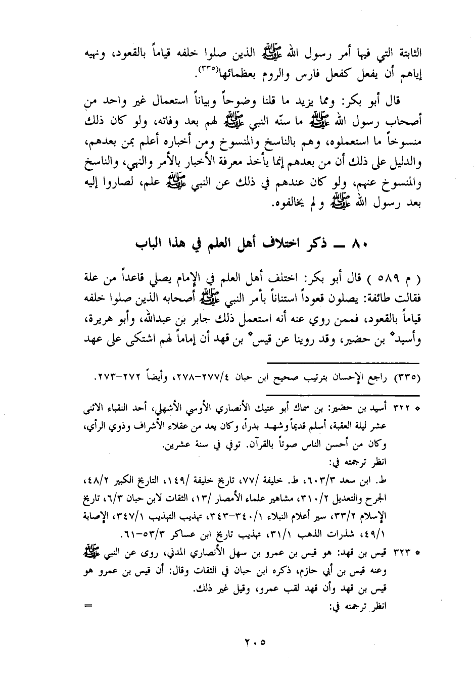 ذِكْرُ اخْتِلَافِ أَهْلِ الْعِلْمِ فِي هَذَا الْبَابِ قَالَ أَبُو بَكْرٍ: اخْتَلَفَ أَهْلُ الْعِلْمِ فِي الْإِمَامِ يُصَلِّي قَاعِدًا مِنْ عِلَّةٍ، فَقَالَتْ طَائِفَةٌ: يُصَلُّونَ قُعُودًا اسْتِنَانًا بِأَمْرِ النَّبِيِّ صَلَّى اللَّهُ عَلَيْهِ وَسَلَّمَ أَصْحَابَهُ الَّذِينَ صَلَّوْا خَلْفَهُ قِيَامًا بِالْقُعُودِ، فَمِمَّنْ رُوِيَ عَنْهُ أَنَّهُ اسْتَعْمَلَ ذَلِكَ جَابِرُ بْنُ عَبْدِ اللهِ، وَأَبُو هُرَيْرَةَ، وَأُسَيْدُ بْنُ حُضَيْرٍ، وَقَدْ رُوِّينَا عَنْ قَيْسِ بْنِ قَهْدٍ أَنَّ إِمَامًا لَهُمُ اشْتَكَى عَلَى عَهْدِ -[206]- رَسُولِ اللهِ صَلَّى اللَّهُ عَلَيْهِ وَسَلَّمَ، قَالَ: فَكَانَ يَؤُمُّنَا جَالِسًا وَنَحْنُ جُلُوسٌ