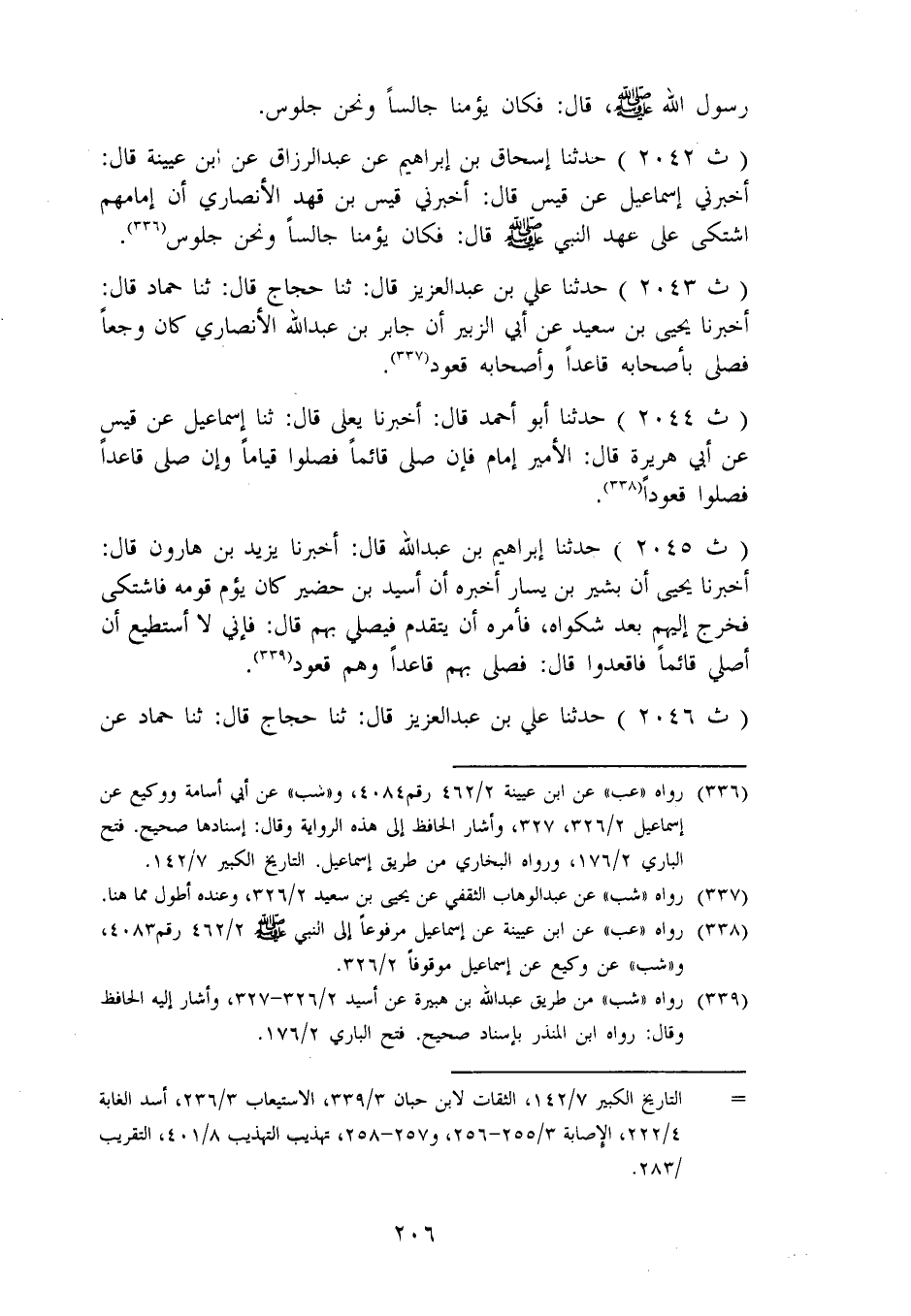 2045 - حَدَّثَنَا إِبْرَاهِيمُ بْنُ عَبْدِ اللهِ، قَالَ: أَخْبَرَنَا يَزِيدُ بْنُ هَارُونَ، قَالَ: أَخْبَرَنَا يَحْيَى، أَنَّ بَشِيرَ بْنَ يَسَارٍ، أَخْبَرَهُ أَنَّ أُسَيْدَ بْنَ حُضَيْرٍ كَانَ يَؤُمُّ قَوْمَهُ فَاشْتَكَى فَخَرَجَ إِلَيْهِمْ بَعْدَ شَكْوَاهُ، فَأَمَرَهُ أَنْ يَتَقَدَّمَ فَيُصَلِّيَ بِهِمْ قَالَ: فَإِنِّي لَا أَسْتَطِيعُ أَنْ أُصَلِّيَ قَائِمًا فَاقْعُدُوا قَالَ: فَصَلَّى بِهِمْ قَاعِدًا وَهُمْ قُعُودٌ "