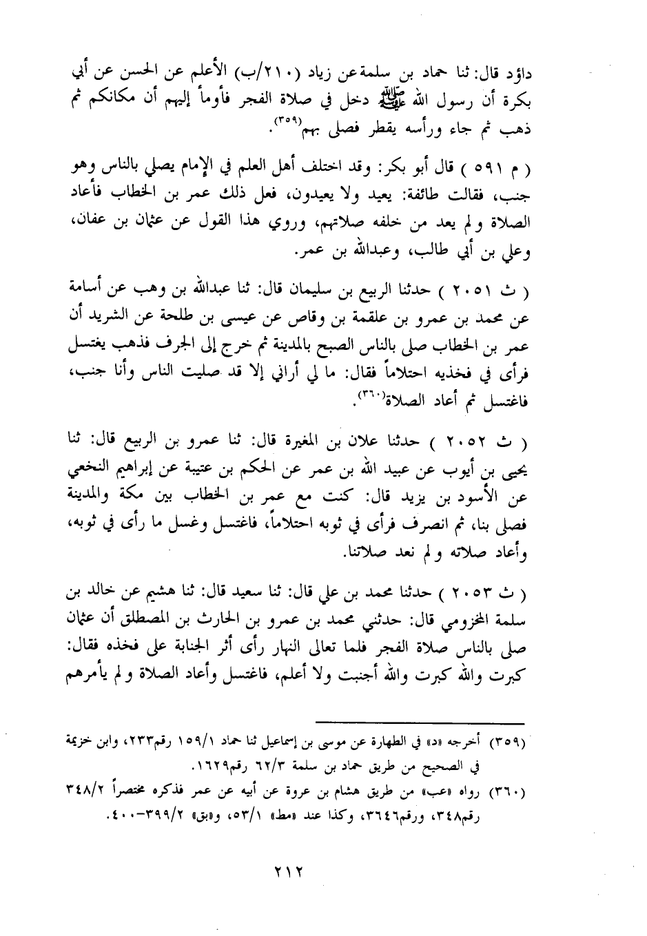 2053 - حَدَّثَنَا مُحَمَّدُ بْنُ عَلِيٍّ، قَالَ: ثنا سَعِيدٌ، قَالَ: ثنا هُشَيْمٌ، عَنْ خَالِدِ بْنِ سَلَمَةَ الْمَخْزُومِيِّ، قَالَ حَدَّثَنِي مُحَمَّدُ بْنُ عَمْرِو بْنِ الْحَارِثِ بْنِ الْمُصْطَلِقِ، أَنَّ عُثْمَانَ، صَلَّى بِالنَّاسِ صَلَاةَ الْفَجْرِ فَلَمَّا تَعَالَى النَّهَارُ رَأَى أَثَرَ الْجَنَابَةِ عَلَى فَخِذِهِ، فَقَالَ: كَبُرَتْ وَاللهِ، كَبُرَتْ وَاللهِ أَجْنَبْتُ وَلَا أَعْلَمُ، فَاغْتَسَلَ وَأَعَادَ الصَّلَاةَ وَلَمْ يَأْمُرْهُمْ -[213]- أَنْ يُعِيدُوا "