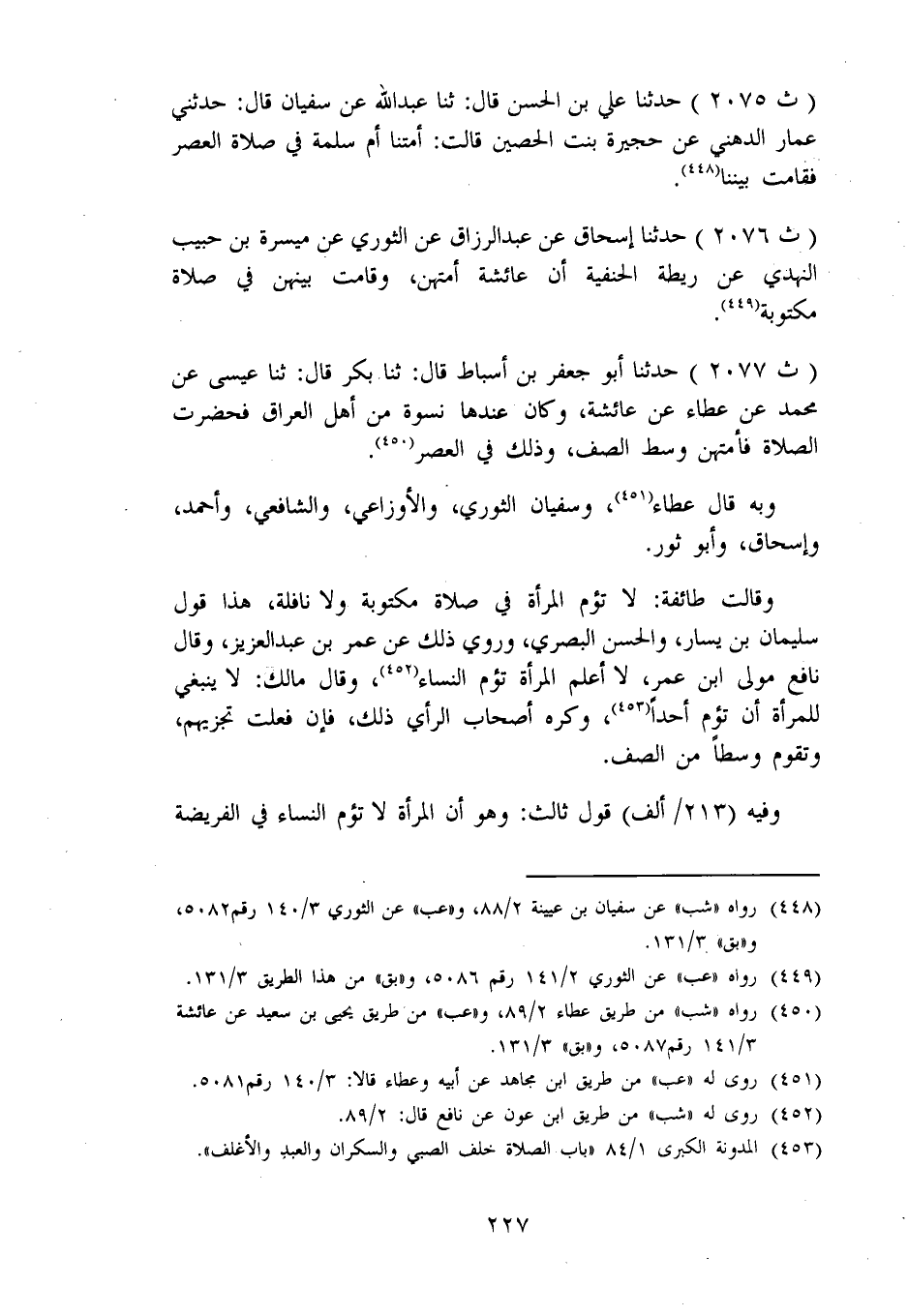 2077 - حَدَّثَنَا أَبُو جَعْفَرِ بْنُ أَسْبَاطٍ، قَالَ: ثنا بَكْرٌ، قَالَ: ثنا عِيسَى، عَنْ مُحَمَّدٍ، عَنْ عَطَاءٍ، عَنْ عَائِشَةَ، وَكَانَ، عِنْدَهَا نِسْوَةٌ مِنْ أَهْلِ الْعِرَاقِ فَحَضَرَتِ الصَّلَاةُ فَأَمَّتْهُنَّ وَسَطَ الصَّفِّ، وَذَلِكَ فِي الْعَصْرِ وَبِهِ قَالَ عَطَاءٌ، وَسُفْيَانُ الثَّوْرِيُّ، وَالْأَوْزَاعِيُّ، وَالشَّافِعِيُّ، وَأَحْمَدُ، وَإِسْحَاقُ، وَأَبُو ثَوْرٍ. وَقَالَتْ طَائِفَةٌ: لَا تَؤُمُّ الْمَرْأَةُ فِي صَلَاةٍ مَكْتُوبَةٍ وَلَا نَافِلَةٍ، هَذَا قَوْلُ سُلَيْمَانَ بْنِ يَسَارٍ، وَالْحَسَنِ الْبَصْرِيِّ، وَرُوِيَ ذَلِكَ عَنْ عُمَرَ بْنِ عَبْدِ الْعَزِيزِ، وَقَالَ نَافِعٌ مَوْلَى ابْنِ عُمَرَ: لَا أَعْلَمُ الْمَرْأَةَ تَؤُمُّ النِّسَاءَ، وَقَالَ مَالِكٌ: لَا يَنْبَغِي لِلْمَرْأَةِ أَنْ تَؤُمَّ أَحَدًا، وَكَرِهَ أَصْحَابُ الرَّأْيِ ذَلِكَ، فَإِنْ فَعَلَتْ تُجْزِيهِمْ وَتَقُومُ وَسَطًا مِنَ الصَّفِّ. وَفِيهِ قَوْلٌ ثَالِثٌ: وَهُوَ أَنَّ الْمَرْأَةَ لَا تَؤُمُّ النِّسَاءَ فِي الْفَرِيضَةِ، -[228]- وَتَؤُمُّهُمْ فِي التَّطَوُّعِ، وَتَقُومُ فِي الصَّفِّ لَا تَقْدُمُهُنَّ، وَرُوِّينَا عَنِ الشَّعْبِيِّ، وَالنَّخَعِيِّ، وَقَتَادَةَ أَنَّهُمْ رَخَّصُوا لِلْمَرْأَةِ أَنْ تَؤُمَّ النِّسَاءَ فِي قِيَامِ شَهْرِ رَمَضَانَ، وَتَقُومَ مَعَهُنَّ فِي صَفِّهِنَّ
