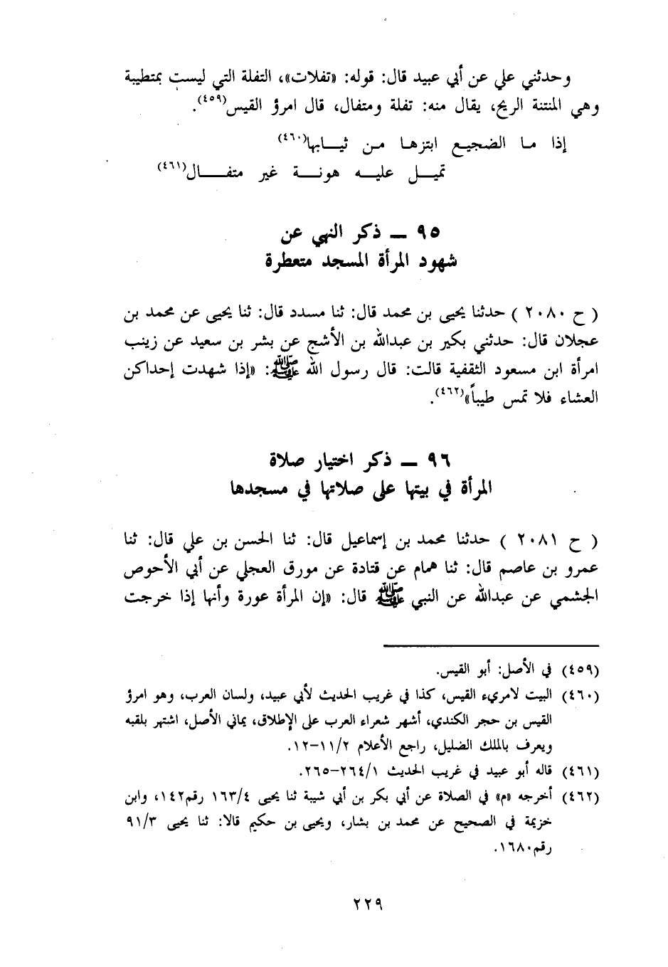 2081 - حَدَّثَنَا مُحَمَّدُ بْنُ إِسْمَاعِيلَ، قَالَ: ثنا الْحَسَنُ بْنُ عَلِيٍّ، قَالَ: ثنا عَمْرُو بْنُ عَاصِمٍ، قَالَ: ثنا هَمَّامٌ، عَنْ قَتَادَةَ، عَنْ مُوَرِّقٍ الْعِجْلِيِّ، عَنْ أَبِي الْأَحْوَصِ الْجُشَمِيِّ، عَنْ عَبْدِ اللهِ، عَنِ النَّبِيِّ صَلَّى اللَّهُ عَلَيْهِ وَسَلَّمَ قَالَ: «إِنَّ الْمَرْأَةَ عَوْرَةٌ وَإِنَّهَا إِذَا خَرَجَتْ -[230]- مِنْ بَيْتِهَا اسْتَشْرَفَهَا الشَّيْطَانُ، فَأَقْرَبُ مَا تَكُونُ إِلَى وَجْهِ اللهِ وَهِيَ فِي قَعْرِ بَيْتِهَا»