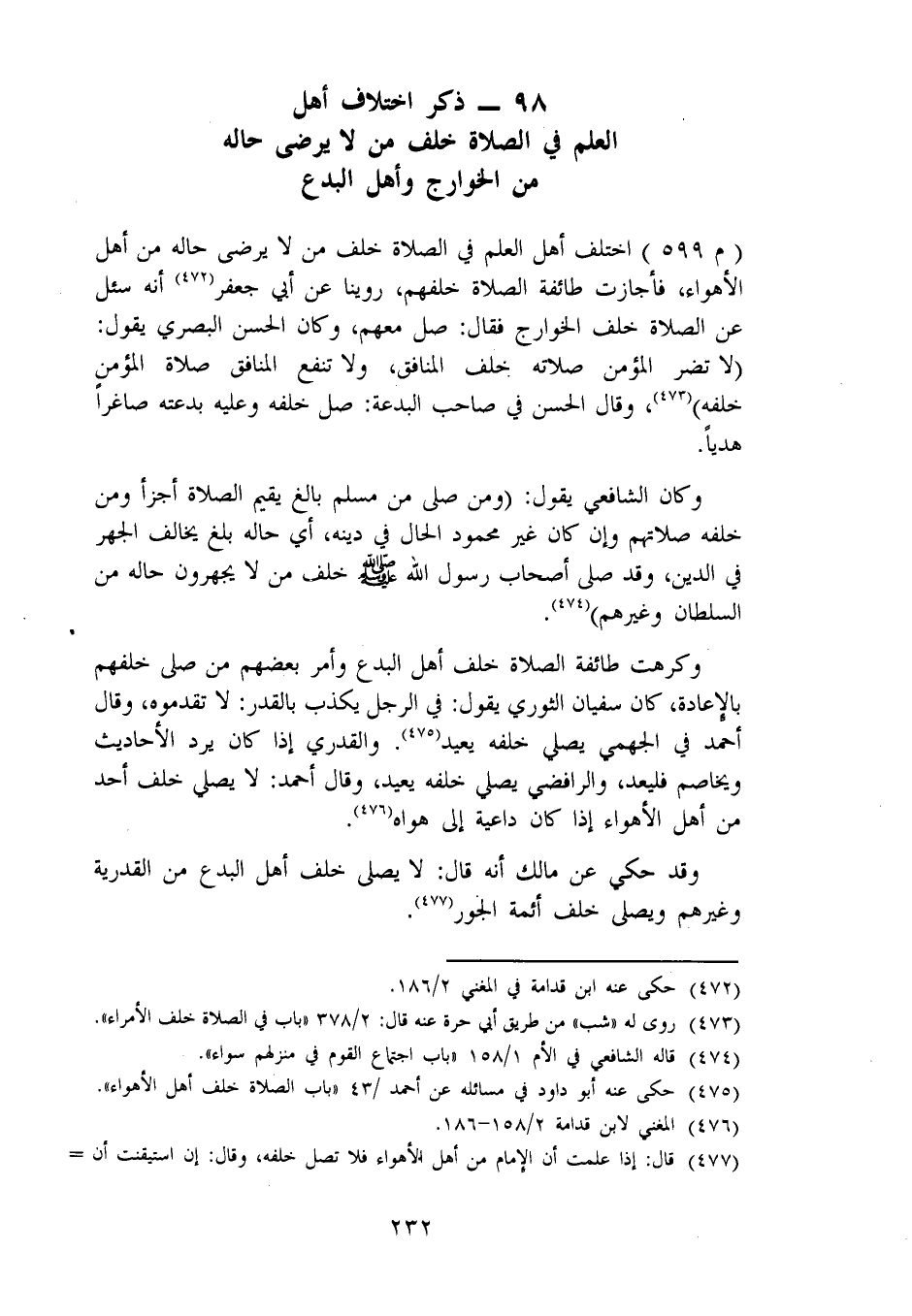 ذِكْرُ اخْتِلَافِ أَهْلِ الْعِلْمِ فِي الصَّلَاةِ خَلْفَ مَنْ لَا يُرْضَى حَالُهُ مِنَ الْخَوَارِجِ وَأَهْلِ الْبِدَعِ اخْتَلَفَ أَهْلُ الْعِلْمِ فِي الصَّلَاةِ خَلْفَ مَنْ لَا يُرْضَى حَالُهُ مِنْ أَهْلِ الْأَهْوَاءِ، فَأَجَازَتْ طَائِفَةٌ الصَّلَاةَ خَلْفَهُمْ، رُوِّينَا عَنْ أَبِي جَعْفَرٍ أَنَّهُ سُئِلَ عَنِ الصَّلَاةِ خَلْفَ الْخَوَارِجِ، فَقَالَ: صَلِّ مَعَهُمْ، وَكَانَ الْحَسَنُ الْبَصْرِيُّ يَقُولُ: لَا تَضُرُّ الْمُؤْمِنَ صَلَاتُهُ خَلْفَ الْمُنَافِقِ، وَلَا تَنْفَعُ الْمُنَافِقَ صَلَاةُ الْمُؤْمِنِ خَلْفَهُ، وَقَالَ الْحَسَنُ فِي صَاحِبِ الْبِدْعَةِ: صَلِّ خَلْفَهُ وَعَلَيْهِ بِدْعَتُهُ صَاغِرًا هَدْيًا. وَكَانَ الشَّافِعِيُّ يَقُولُ: وَمَنْ صَلَّى مِنْ مُسْلِمٍ بَالِغٍ يُقِيمُ الصَّلَاةَ أَجْزَأَ وَمَنْ خَلْفَهُ صَلَاتُهُمْ، وَإِنْ كَانَ غَيْرَ مَحْمُودِ الْحَالِ فِي دِينِهِ، أَيْ حَالُهُ بَلَغَ يُخَالِفُ الْجَهْرَ فِي الدِّينِ، وَقَدْ صَلَّى أَصْحَابُ رَسُولِ اللهِ صَلَّى اللَّهُ عَلَيْهِ وَسَلَّمَ خَلْفَ مَنْ لَا يَجْهَرُونَ حَالَهُ مِنَ السُّلْطَانِ وَغَيْرِهِمْ. وَكَرِهَتْ طَائِفَةٌ الصَّلَاةَ خَلْفَ أَهْلِ الْبِدَعِ وَأَمَرَ بَعْضُهُمْ مَنْ صَلَّى خَلْفَهُمْ بِالْإِعَادَةِ، كَانَ سُفْيَانُ الثَّوْرِيُّ يَقُولُ: فِي الرَّجُلِ يُكَذِّبُ بِالْقَدَرِ: لَا تُقَدِّمُوهُ، وَقَالَ أَحْمَدُ فِي الْجَهْمِيِّ يُصَلَّى خَلْفَهُ: يُعِيدُ، وَالْقَدَرِيُّ إِذَا كَانَ يَرُدُّ الْأَحَادِيثَ وَيُخَاصِمُ فَلْيُعِدْ، وَالرَّافِضِيُّ يُصَلِّي خَلْفَهُ يُعِيدُ، وَقَالَ أَحْمَدُ: لَا يُصَلَّى خَلْفَ أَحَدٍ مِنْ أَهْلِ الْأَهْوَاءِ إِذَا كَانَ دَاعِيَةً إِلَى هَوَاهُ. وَقَدْ حُكِيَ عَنْ مَالِكٍ أَنَّهُ قَالَ: لَا يُصَلَّى خَلْفَ أَهْلِ الْبِدَعِ مِنَ الْقَدَرِيَّةِ وَغَيْرِهِمْ، وَيُصَلَّى خَلْفَ أَئِمَّةِ الْجَوْرِ