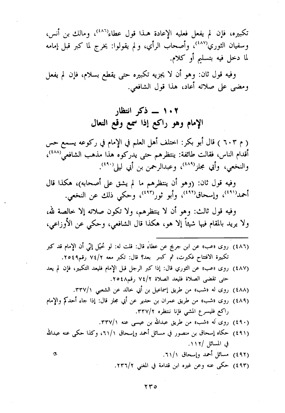 ذِكْرُ انْتِظَارِ الْإِمَامِ وَهُوَ رَاكِعٌ إِذَا سَمِعَ وَقْعَ النِّعَالِ قَالَ أَبُو بَكْرٍ: اخْتَلَفَ أَهْلُ الْعِلْمِ فِي الْإِمَامِ فِي رُكُوعِهِ يَسْمَعُ حِسَّ أَقْدَامِ النَّاسِ، فَقَالَتْ طَائِفَةٌ: يَنْتَظِرُهُمْ حَتَّى يُدْرِكُوهُ، هَذَا مَذْهَبُ الشَّافِعِيِّ، وَالنَّخَعِيِّ، وَأَبِي مِجْلَزٍ، وَعَبْدِ الرَّحْمَنِ بْنِ أَبِي لَيْلَى. وَفِيهِ قَوْلٌ ثَانٍ، وَهُوَ: أَنْ يَنْتَظِرَهُمْ مَا لَمْ يَشُقَّ عَلَى أَصْحَابِهِ، هَكَذَا قَالَ أَحْمَدُ، وَإِسْحَاقُ، وَأَبُو ثَوْرٍ، وَحُكِيَ ذَلِكَ عَنِ النَّخَعِيِّ. وَفِيهِ قَوْلٌ ثَالِثٌ: وَهُوَ أَنْ لَا يَنْتَظِرَهُمْ، وَلَا تَكُونُ صَلَاتُهُ إِلَّا خَالِصَةً لِلَّهِ، وَلَا يُرِيدُ بِالْمُقَامِ فِيهَا شَيْئًا إِلَّا هُوَ، هَكَذَا قَالَ الشَّافِعِيُّ، وَحُكِيَ عَنِ الْأَوْزَاعِيِّ، -[236]- وَالنُّعْمَانِ، وَيَعْقُوبَ أَنَّهُمْ قَالُوا: لَا يَنْتَظِرُهُمْ يَرْكَعُ كَمَا كَانَ يَرْكَعُ. قَالَ أَبُو بَكْرٍ: لَيْسَ بِحَبْسِ الْإِمَامِ مَنْ سَبَقَ لِمَنْ يَأْتِي بَعْدُ مَعْنًى، وَرُبَّمَا اتَّصَلَ مَجِيءُ النَّاسِ