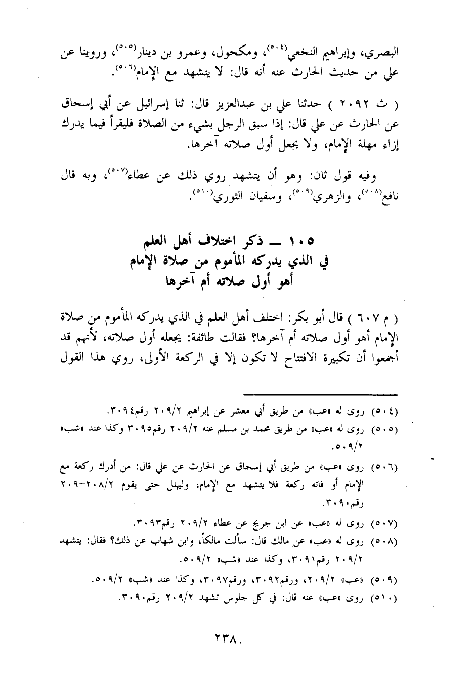 ذِكْرُ اخْتِلَافِ أَهْلِ الْعِلْمِ فِي الَّذِي يُدْرِكُهُ الْمَأْمُومُ مِنْ صَلَاةِ الْإِمَامِ أَهُوَ أَوَّلُ صَلَاتِهِ أَمْ آخِرُهَا؟ قَالَ أَبُو بَكْرٍ: اخْتَلَفَ أَهْلُ الْعِلْمِ فِي الَّذِي يُدْرِكُهُ الْمَأْمُومُ مِنْ صَلَاةِ الْإِمَامِ أَهُوَ أَوَّلُ صَلَاتِهِ أَمْ آخِرُهَا؟، فَقَالَتْ طَائِفَةٌ: يَجْعَلُهُ أَوَّلَ صَلَاتِهِ؛ لِأَنَّهُمْ قَدْ أَجْمَعُوا أَنَّ تَكْبِيرَةَ الِافْتِتَاحِ لَا تَكُونُ إِلَّا فِي الرَّكْعَةِ الْأُولَى، رُوِيَ هَذَا الْقَوْلُ -[239]- عَنْ عُمَرَ بْنِ الْخَطَّابِ، وَعَلِيِّ بْنِ أَبِي طَالِبٍ، وَأَبِي الدَّرْدَاءِ، وَلَيْسَ يَثْبُتُ عَنْ وَاحِدٍ مِنْهُمْ، وَبِهِ قَالَ سَعِيدُ بْنُ الْمُسَيِّبِ، وَالْحَسَنُ الْبَصْرِيُّ، وَعُمَرُ بْنُ عَبْدِ الْعَزِيزِ، وَمَكْحُولٌ، وَعَطَاءٌ، وَالزُّهْرِيُّ، وَالْأَوْزَاعِيُّ، وَسَعِيدُ بْنُ عَبْدِ الْعَزِيزِ، وَإِسْحَاقُ بْنُ رَاهَوَيْهِ، وَالْمُزَنِيُّ. وَقَالَتْ طَائِفَةٌ: يَجْعَلُ مَا أَدْرَكَ مَعَ الْإِمَامِ آخِرَ صَلَاتِهِ، كَذَلِكَ قَالَ ابْنُ عُمَرَ، وَرُوِيَ ذَلِكَ عَنِ ابْنِ مَسْعُودٍ مُرْسَلًا