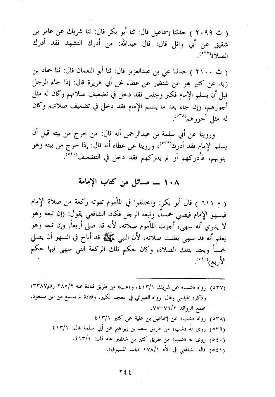 مَسَائِلُ مِنْ كِتَابِ الْإِمَامَةِ قَالَ أَبُو بَكْرٍ: وَاخْتَلَفُوا فِي الْمَأْمُومِ تَفُوتُهُ رَكْعَةٌ مِنْ صَلَاةِ الْإِمَامِ فَيَسْهُو الْإِمَامُ فَيُصَلِّي خَمْسًا، وَتَبِعَهُ الرَّجُلُ، فَكَانَ الشَّافِعِيُّ يَقُولُ: إِنْ تَبِعَهُ وَهُوَ لَا يَدْرِي أَنَّهُ سَهَا، أَجَزَتِ الْمَأْمُومَ صَلَاتُهُ، لِأَنَّهُ قَدْ صَلَّى أَرْبَعًا، وَإِنْ تَبِعَهُ وَهُوَ يَعْلَمُ أَنَّهُ قَدْ سَهَا بَطَلَتْ صَلَاتُهُ، لِأَنَّ النَّبِيَّ صَلَّى اللَّهُ عَلَيْهِ وَسَلَّمَ قَدْ أَبَاحَ فِي السَّهْوِ أَنْ يُصَلِّيَ خَمْسًا وَيَعْتَدُّ بِتِلْكَ الصَّلَاةِ، وَكَانَ حُكْمُ تِلْكَ الرَّكْعَةِ الَّتِي سَهَا فِيهَا حُكْمَ الْأَرْبَعِ "