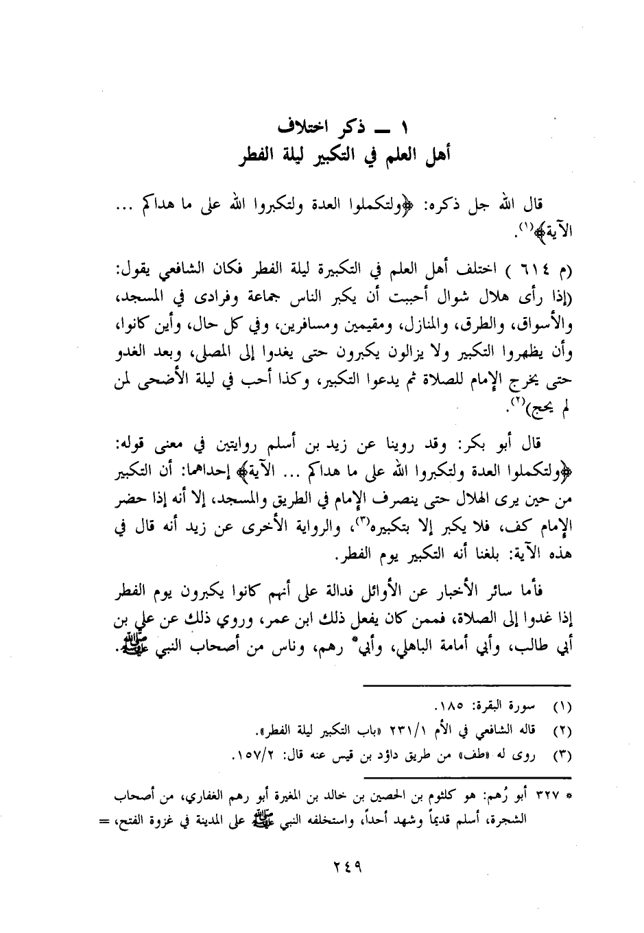 ذِكْرُ اخْتِلَافِ أَهْلِ الْعِلْمِ فِي التَّكْبِيرِ لَيْلَةَ الْفِطْرِ قَالَ اللهُ جَلَّ ذَكَرَهُ: {وَلْتُكْمِلُوا الْعِدَّةَ وَلِتُكَبِّرُوا اللهَ عَلَى مَا هَدَاكُمْ} [البقرة: 185] الْآيَةَ، اخْتَلَفَ أَهْلُ الْعِلْمِ فِي التَّكْبِيرِ لَيْلَةَ الْفِطْرِ، فَكَانَ الشَّافِعِيُّ يَقُولُ: إِذَا رَأَى هِلَالَ شَوَّالٍ أَحْبَبْتُ أَنْ يُكَبِّرَ النَّاسُ جَمَاعَةً وَفُرَادَى فِي الْمَسْجِدِ، وَالْأَسْوَاقِ، وَالطُّرُقِ، وَالْمَنَازِلِ، وَمُقِيمِينَ وَمُسَافِرِينَ، وَفِي كُلِّ حَالٍ، وَأَيْنَ كَانُوا وَأَنْ يُظْهِرُوا التَّكْبِيرَ وَلَا يَزَالُونَ يُكَبِّرُونَ حَتَّى يَغْدُوا إِلَى الْمُصَلِّي، وَبَعْدَ الْغُدُوِّ حَتَّى يَخْرُجَ الْإِمَامُ لِلصَّلَاةِ ثُمَّ يَدَعُوا التَّكْبِيرَ، وَكَذَا أُحِبُّ فِي لَيْلَةِ الْأَضْحَى لِمَنْ لَمْ يَحُجَّ قَالَ أَبُو بَكْرٍ: وَقَدْ رُوِّينَا عَنْ زَيْدِ بْنِ أَسْلَمَ رِوَايَتَيْنِ فِي مَعْنَى قَوْلِهِ: {وَلِتُكْمِلُوا الْعِدَّةَ وَلِتُكَبِّرُوا اللهَ عَلَى مَا هَدَاكُمْ} [البقرة: 185] الْآيَةَ، إِحْدَاهُمَا: أَنَّ التَّكْبِيرَ مِنْ حِينَ يُرَى الْهِلَالُ حَتَّى يَنْصَرِفَ الْإِمَامُ فِي الطَّرِيقِ وَالْمَسْجِدِ، إِلَّا أَنَّهُ إِذَا حَضَرَ الْإِمَامُ كَفَّ، فَلَا يُكَبِّرُ إِلَّا بِتَكْبِيرِهِ، وَالرِّوَايَةُ الْأُخْرَى عَنْ زَيْدٍ أَنَّهُ قَالَ فِي هَذِهِ الْآيَةِ: بَلَغَنَا أَنَّهُ التَّكْبِيرُ يَوْمَ الْفِطْرِ فَأَمَّا سَائِرُ الْأَخْبَارِ عَنِ الْأَوَائِلِ فَدَالَّةٌ عَلَى أَنَّهُمْ كَانُوا يُكَبِّرُونَ يَوْمَ الْفِطْرِ إِذَا غَدَوْا إِلَى الصَّلَاةِ، فَمِمَّنْ كَانَ يَفْعَلُ ذَلِكَ ابْنُ عُمَرَ، وَرُوِيَ ذَلِكَ عَنْ عَلِيِّ بْنِ أَبِي طَالِبٍ، وَأَبِي أُمَامَةَ الْبَاهِلِيِّ، وَأَبِي رُهْمٍ، وَنَاسٍ مِنْ أَصْحَابِ النَّبِيِّ صَلَّى اللَّهُ عَلَيْهِ وَسَلَّمَ