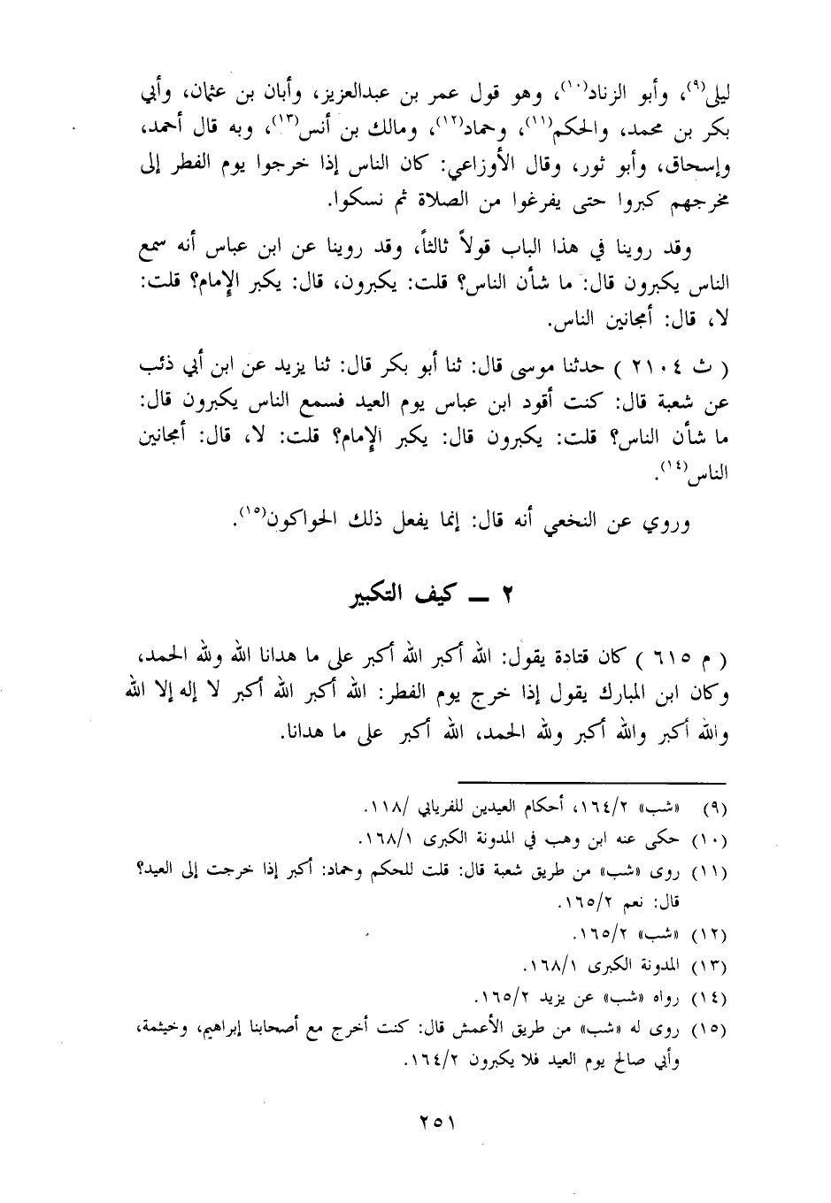 كَيْفَ التَّكْبِيرُ كَانَ قَتَادَةُ يَقُولُ: اللهُ أَكْبَرُ اللهُ أَكْبَرُ عَلَى مَا هَدَانَا اللهُ وَلِلَّهِ الْحَمْدُ، وَكَانَ ابْنُ الْمُبَارَكِ يَقُولُ إِذَا خَرَجَ يَوْمَ الْفِطْرِ: اللهُ أَكْبَرُ اللهُ أَكْبَرُ لَا إِلَهَ إِلَّا اللهُ، وَاللهُ أَكْبَرُ وَاللهُ أَكْبَرُ وَلِلَّهِ الْحَمْدُ، اللهُ أَكْبَرُ عَلَى مَا هَدَانَا. -[252]- وَذُكِرَ لِأَحْمَدَ قَوْلُ ابْنِ الْمُبَارَكِ، فَقَالَ: «هَذَا وَاسِعٌ» ، وَكَانَ مَالِكٌ لَا يَحُدُّ فِيهِ حَدًّا