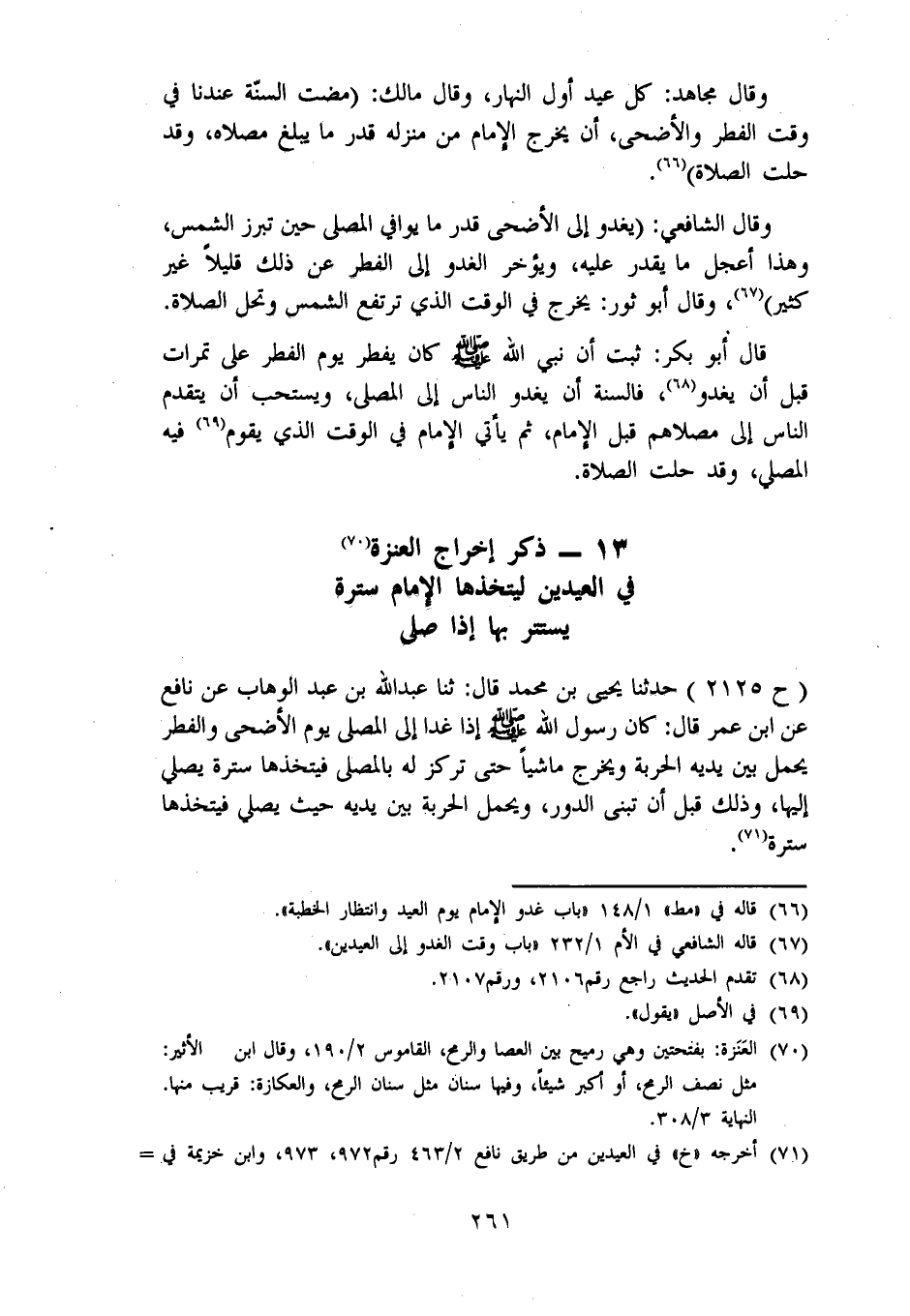 2125 - حَدَّثَنَا يَحْيَى بْنُ مُحَمَّدٍ، قَالَ: ثنا عَبْدُ اللهِ بْنُ عَبْدِ الْوَهَّابِ، عَنْ نَافِعٍ، عَنِ ابْنِ عُمَرَ، قَالَ: كَانَ رَسُولُ اللهِ صَلَّى اللَّهُ عَلَيْهِ وَسَلَّمَ إِذَا غَدَا إِلَى الْمُصَلَّى يَوْمَ الْأَضْحَى وَالْفِطْرِ يَحْمِلُ بَيْنَ يَدَيْهِ الْحَرْبَةَ وَيَخْرُجُ مَاشِيًا حَتَّى تُرْكَزَ لَهُ بِالْمُصَلَّى فَيَتَّخِذَهَا سُتْرَةً يُصَلِّي إِلَيْهَا، وَذَلِكَ قَبْلَ أَنْ تُبْنَى الدُّورُ، وَيُحْمَلُ الْحَرْبَةُ بَيْنَ يَدَيْهِ حَيْثُ يُصَلِّي فَيَتَّخِذَهَا سُتْرَةً "