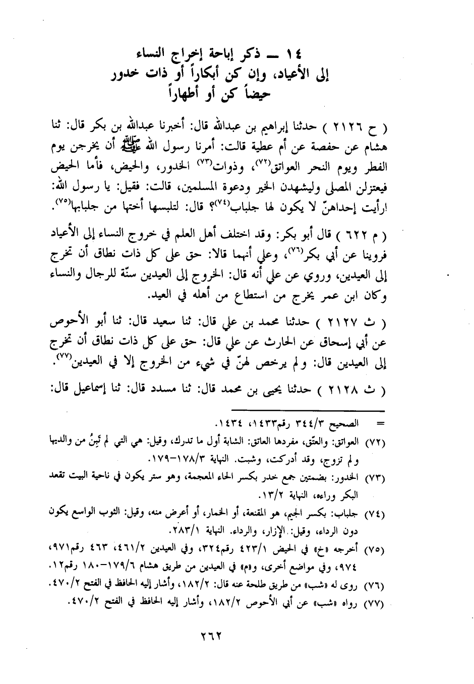 2126 - حَدَّثَنَا إِبْرَاهِيمُ بْنُ عَبْدِ اللهِ، قَالَ: أَخْبَرَنَا عَبْدُ اللهِ بْنُ بَكْرٍ، قَالَ: ثنا هِشَامٌ، عَنْ حَفْصَةَ، عَنْ أُمِّ عَطِيَّةَ، قَالَتْ: أَمَرَنَا رَسُولُ اللهِ صَلَّى اللَّهُ عَلَيْهِ وَسَلَّمَ أَنْ يَخْرُجْنَ يَوْمَ الْفِطْرِ وَيَوْمَ النَّحْرِ الْعَوَاتِقُ، وَذَوَاتُ الْخُدُورِ، وَالْحُيَّضُ، فَأَمَّا الْحُيَّضُ فَيَعْتَزِلْنَ الْمُصَلَّى وَلْيَشْهَدْنَ الْخَيْرَ وَدَعْوَةَ الْمُسْلِمِينَ، قَالَتْ: فَقِيلَ: يَا رَسُولَ اللهِ: أَرَأَيْتَ إِحْدَاهُنَّ لَا يَكُونُ لَهَا جِلْبَابٌ؟ قَالَ: «لِتُلْبِسْهَا أُخْتُهَا مِنْ جِلْبَابِهَا» قَالَ أَبُو بَكْرٍ: وَقَدِ اخْتَلَفَ أَهْلُ الْعِلْمِ فِي خُرُوجِ النِّسَاءِ إِلَى الْأَعْيَادِ، فرُوِّينَا عَنْ أَبِي بَكْرٍ، وَعَلِيٍّ أَنَّهُمَا قَالَا: حَقٌّ عَلَى كُلِّ ذَاتِ نِطَاقٍ أَنْ تَخْرُجَ إِلَى الْعِيدَيْنِ، وَرُوِيَ عَنْ عَلِيٍّ أَنَّهُ قَالَ: الْخُرُوجُ إِلَى الْعِيدَيْنِ سُنَّةٌ لِلرِّجَالِ وَالنِّسَاءِ، وَكَانَ ابْنُ عُمَرَ يُخْرِجُ مَنِ اسْتَطَاعَ مِنْ أَهْلِهِ فِي الْعِيدِ