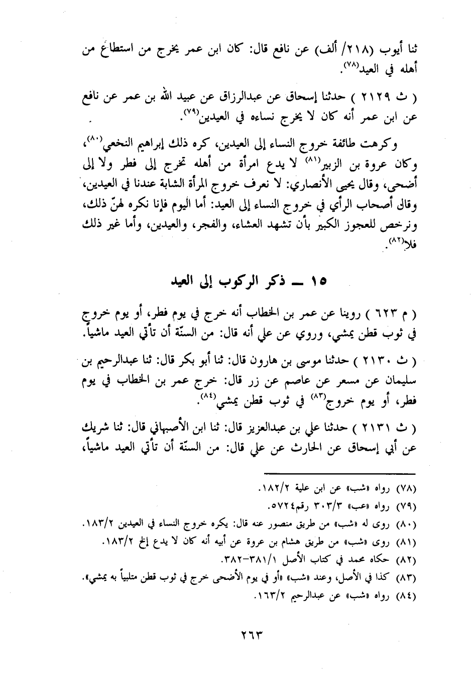 2131 - حَدَّثَنَا عَلِيُّ بْنُ عَبْدِ الْعَزِيزِ، قَالَ: ثنا ابْنُ الْأَصْبَهَانِيِّ، قَالَ: ثنا شَرِيكٌ، عَنْ أَبِي إِسْحَاقَ، عَنِ الْحَارِثِ، عَنْ عَلِيٍّ، قَالَ: «مِنَ السُّنَّةِ أَنْ تَأْتِيَ، الْعِيدَ مَاشِيًا، -[264]- وَأَنْ تَأْكُلَ قَبْلَ أَنْ تَخْرُجَ وَتَشْرَبَ» وَكَتَبَ عُمَرُ بْنُ عَبْدِ الْعَزِيزِ إِلَى أَهْلِ الشَّامِ: مَنِ اسْتَطَاعَ مِنْكُمْ أَنْ يَأْتِيَ الْعِيدَ مَاشِيًا فَلْيَأْتِهِ مَاشِيًا، وَكَانَ النَّخَعِيُّ يَكْرَهُ أَنْ يَرْكَبَ فِي الْعِيدَيْنِ وَكَانَ يَمْشِي، وَمِمَّنِ اسْتَحَبَّ الْمَشْيَ إِلَى الْعِيدَيْنِ سُفْيَانُ الثَّوْرِيُّ، وَالشَّافِعِيُّ وَأَحْمَدُ، وَقَالَ مَالِكٌ: أَمَّا نَحْنُ فَنَمْشِي وَمَكَانُنَا قَرِيبٌ، وَأَمَّا مَنْ بَعُدَ ذَلِكَ عَلَيْهِ فَلَا بَأْسَ أَنْ يَرْكَبَ. قَالَ أَبُو بَكْرٍ: الْمَشْيُ إِلَى الْعِيدِ أَحْسَنُ، وَأَقْرَبُ إِلَى التَّوَاضُعِ، وَلَا شَيْءَ عَلَى مَنْ رَكِبَ قَالَ أَبُو بَكْرٍ: وَيُسْتَحَبُّ أَنْ يَلْبَسَ فِي الْعِيدَيْنِ مِنْ صَالِحِ ثِيَابِهِ كَمَا يَلْبَسُ فِي الْجُمُعَةِ، وَرُوِّينَا عَنِ ابْنِ عُمَرَ أَنَّهُ كَانَ يُصَلِّي الْفَجْرَ يَوْمَ الْعِيدَيْنِ عَلَيْهِ ثِيَابُ الْعِيدِ