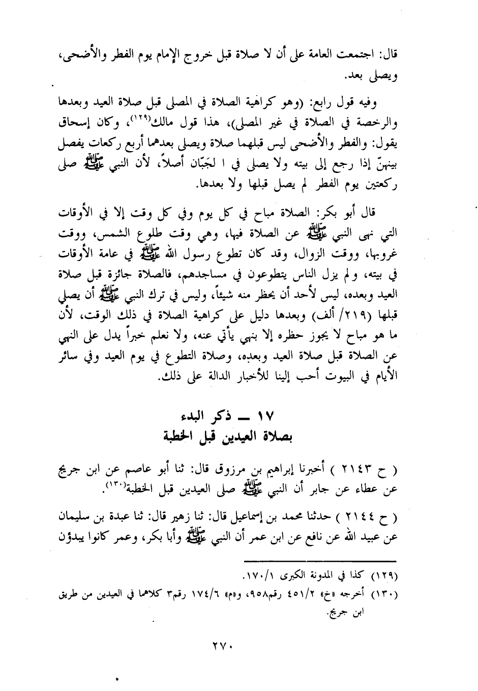 2144 - حَدَّثَنَا مُحَمَّدُ بْنُ إِسْمَاعِيلَ، قَالَ: ثنا زُهَيْرٌ، قَالَ: ثنا عَبْدَةُ بْنُ سُلَيْمَانَ، عَنْ عُبَيْدِ اللهِ، عَنْ نَافِعٍ، عَنِ ابْنِ عُمَرَ، أَنَّ النَّبِيَّ صَلَّى اللَّهُ عَلَيْهِ وَسَلَّمَ وَأَبَا بَكْرٍ، وَعُمَرَ كَانُوا يَبْدَءُونَ -[271]- بِالصَّلَاةِ قَبْلَ الْخُطْبَةِ فِي الْعِيدِ " قَالَ أَبُو بَكْرٍ: فَقَدْ ثَبَتَ عَنْ رَسُولِ اللهِ صَلَّى اللَّهُ عَلَيْهِ وَسَلَّمَ أَنَّهُ بَدَأَ بِالصَّلَاةِ قَبْلَ الْخُطْبَةِ فِي يَوْمِ الْعِيدِ، وَكَذَلِكَ فَعَلَ الْخُلَفَاءُ الرَّاشِدُونَ الْمَهْدِيُّونَ، وَعَلَيْهِ عَوَّامُ عُلَمَاءِ أَهْلِ الْأَمْصَارِ. فَمِمَّنْ كَانَ يَبْدَأُ بِالصَّلَاةِ قَبْلَ الْخُطْبَةِ أَبُو بَكْرٍ الصِّدِّيقُ، وَعُمَرُ بْنُ الْخَطَّابِ، وَعُثْمَانُ بْنُ عَفَّانَ، وَعَلِيُّ بْنُ أَبِي طَالِبٍ، وَالْمُغِيرَةُ بْنُ شُعْبَةَ، وَاْبْنُ مَسْعُودٍ وَهَذا قَوْلُ ابْنِ عَبَّاسٍ، وَسُفْيَانُ الثَّوْرِيُّ، وَالْأَوْزَاعِيُّ، وَالشَّافِعِيُّ، وَأَبُو ثَوْرٍ، وَإِسْحَاقُ، وَأَصْحَابُ الرَّأْيِ