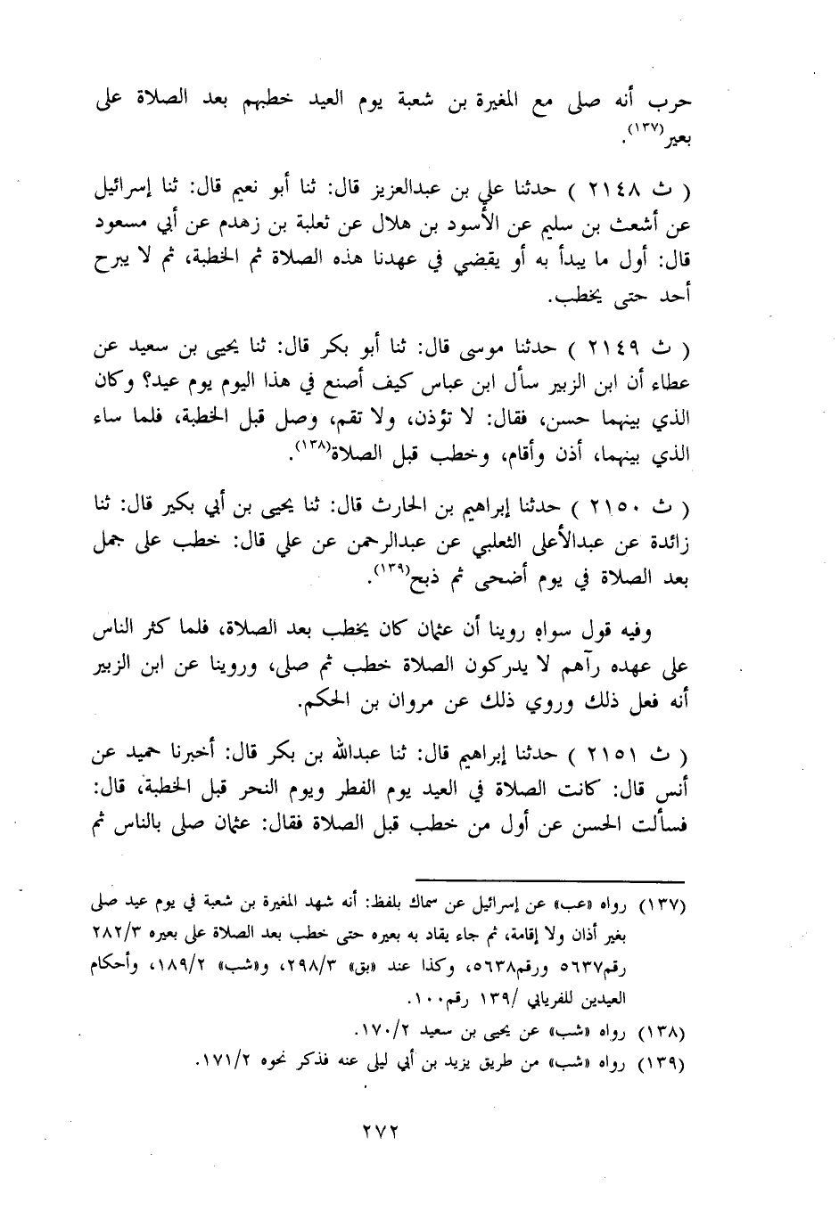 2149 - حَدَّثَنَا مُوسَى، قَالَ: ثنا أَبُو بَكْرٍ، قَالَ: ثنا يَحْيَى بْنُ سَعِيدٍ، عَنْ عَطَاءٍ، أَنَّ ابْنَ الزُّبَيْرِ، سَأَلَ ابْنَ عَبَّاسٍ كَيْفَ أَصْنَعُ فِي هَذَا الْيَوْمِ يَوْمِ عِيدٍ؟ وَكَانَ الَّذِي بَيْنَهُمَا حَسَنٌ، فَقَالَ: «لَا تُؤَذِّنُ، وَلَا تُقِمْ، وَصَلِّ قَبْلَ الْخُطْبَةِ، فَلَمَّا سَاءَ الَّذِي بَيْنَهُمَا، أَذَّنَ وَأَقَامَ، وَخَطَبَ قَبْلَ الصَّلَاةِ»