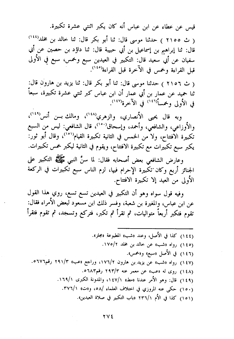2156 - حَدَّثَنَا مُوسَى، قَالَ: ثنا أَبُو بَكْرٍ، قَالَ: ثنا يَزِيدُ بْنُ هَارُونَ، قَالَ: ثنا حُمَيْدٌ، عَنْ عَمَّارٍ بْنِ أَبِي عَمَّارٍ، أَنَّ ابْنَ عَبَّاسٍ، «كَبَّرَ ثِنْتَيْ عَشْرَةَ تَكْبِيرَةً، سَبْعًا فِي الْأُولَى وَخَمْسًا فِي الْآخِرَةِ» وَبِهِ قَالَ يَحْيَى الْأَنْصَارِيُّ، وَالزُّهْرِيُّ، وَمَالِكُ بْنُ أَنَسٍ، وَالْأَوْزَاعِيُّ، وَالشَّافِعِيُّ، وَأَحْمَدُ، وَإِسْحَاقُ، قَالَ الشَّافِعِيُّ: لَيْسَ مِنَ السَّبْعِ تَكْبِيرَةُ الِافْتِتَاحِ، وَلَا مِنَ الْخَمْسِ فِي الثَّانِيَةِ تَكْبِيرَةُ الْقِيَامِ، وَقَالَ أَبُو ثَوْرٍ: يُكَبِّرُ سَبْعَ تَكْبِيرَاتٍ مَعَ تَكْبِيرَةِ الِافْتِتَاحِ، وَيَقُومُ فِي الثَّانِيَةِ لِيُكَبِّرَ خَمْسَ تَكْبِيرَاتٍ. وَعَارَضَ الشَّافِعِيُّ بَعْضَ أَصْحَابِهِ فَقَالَ: لَمَّا سَنَّ النَّبِيُّ صَلَّى اللَّهُ عَلَيْهِ وَسَلَّمَ التَّكْبِيرَ عَلَى الْجَنَائِزِ أَرْبَعًا وَكَانَ تَكْبِيرَةُ الْإِحْرَامِ فِيهَا، لَزِمَ النَّاسَ سَبْعُ تَكْبِيرَاتٍ فِي الرَّكْعَةِ الْأُولَى مِنَ الْعِيدِ إِلَّا تَكْبِيرَةَ الِافْتِتَاحِ. وَفِيهِ قَوْلٌ سِوَاهُ وَهُوَ أَنَّ التَّكْبِيرَ فِي الْعِيدَيْنِ تِسْعٌ تِسْعٌ، رُوِيَ هَذَا الْقَوْلُ عَنِ ابْنِ عَبَّاسٍ، وَالْمُغِيرَةِ بْنِ شُعْبَةَ، وَفَسَّرَ ذَلِكَ ابْنُ مَسْعُودٍ لِبَعْضِ الْأُمَرَاءِ فَقَالَ: تَقُومُ فَتُكَبِّرُ أَرْبَعًا مُتَوَالِيَاتٍ، ثُمَّ تَقْرَأُ ثُمَّ تُكَبِّرُ، فَتَرْكَعُ وَتَسْجُدُ، ثُمَّ تَقُومُ فَتَقْرَأُ -[275]- ثُمَّ تُكَبِّرُ أَرْبَعًا تَرْكَعُ بِآخَرِهِنَ، وَحَضَرَ قَوْلُ ابْنِ مَسْعُودٍ هَذَا حُذَيْفَةُ، وَأَبُو مُوسَى الْأَشْعَرِيُّ، وَأَبُو مَسْعُودٍ عُقْبَةُ بْنُ عَمْرٍو فَقَالُوا: صَدَقَ أَبُو عَبْدِ الرَّحْمَنِ، وَرُوِيَ هَذَا الْقَوْلُ عَنْ أَنَسِ بْنِ مَالِكٍ، وَسَعِيدِ بْنِ الْمُسَيِّبِ، وَبِهِ قَالَ النَّخَعِيُّ