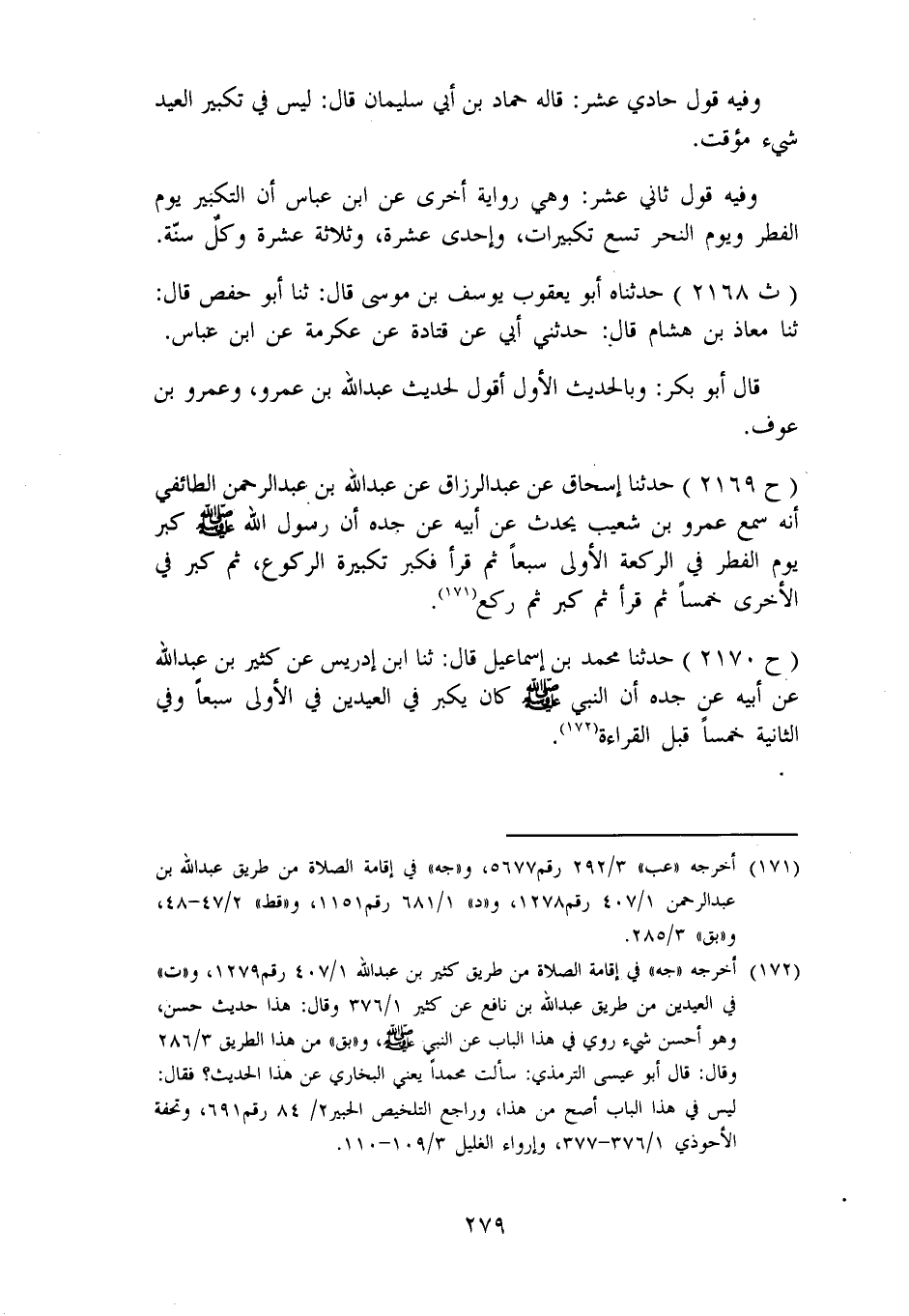 2170 - حَدَّثَنَا مُحَمَّدُ بْنُ إِسْمَاعِيلَ، قَالَ: ثنا ابْنُ إِدْرِيسَ، عَنْ كَثِيرِ بْنِ عَبْدِ اللهِ، عَنْ أَبِيهِ، عَنْ جَدِّهِ، أَنَّ النَّبِيَّ صَلَّى اللَّهُ عَلَيْهِ وَسَلَّمَ كَانَ يُكَبِّرُ فِي الْعِيدَيْنِ فِي الْأُولَى سَبْعًا وَفِي الثَّانِيَةِ خَمْسًا قَبْلَ الْقِرَاءَةِ "