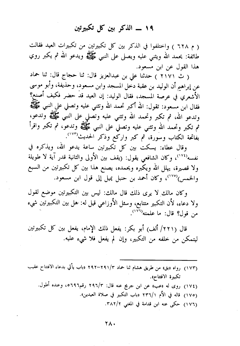 الذِّكْرُ بَيْنَ كُلِّ تَكْبِيرَتَيْنِ وَاخْتَلَفُوا فِي الذِّكْرِ بَيْنَ كُلِّ تَكْبِيرَتَيْنِ مِنْ تَكْبِيرَاتِ الْعِيدِ فَقَالَتْ طَائِفَةٌ: يَحْمَدُ اللهَ وَيُثْنِي عَلَيْهِ وَيُصَلِّي عَلَى النَّبِيِّ صَلَّى اللَّهُ عَلَيْهِ وَسَلَّمَ وَيَدْعُو اللهَ ثُمَّ يُكَبِّرُ، رُوِيَ هَذَا الْقَوْلُ عَنِ ابْنِ مَسْعُودٍ