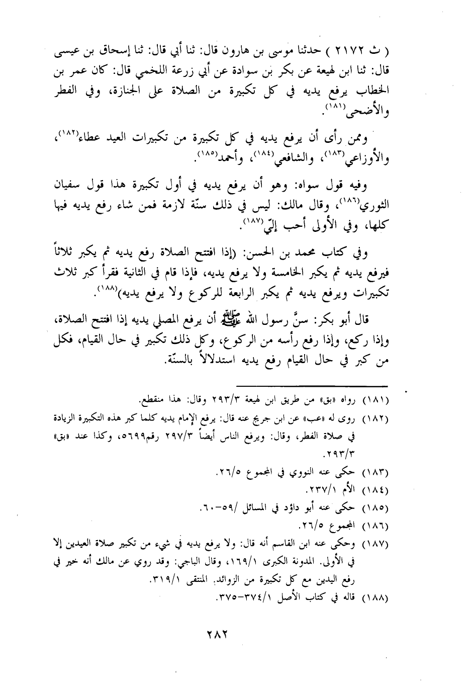 2172 - حَدَّثَنَا مُوسَى بْنُ هَارُونَ، قَالَ: ثنا أَبِي قَالَ: ثنا إِسْحَاقُ بْنُ عِيسَى، قَالَ: ثنا ابْنُ لَهِيعَةَ، عَنْ بَكْرِ بْنِ سَوَادَةَ، عَنْ أَبِي زُرْعَةَ اللَّخْمِيِّ، قَالَ: كَانَ عُمَرُ بْنُ الْخَطَّابِ يَرْفَعُ يَدَيْهِ فِي كُلِّ تَكْبِيرَةٍ مِنَ الصَّلَاةِ عَلَى الْجَنَازَةِ، وَفِي الْفِطْرِ وَالْأَضْحَى " وَمِمَّنْ رَأَى أَنْ يَرْفَعَ يَدَيْهِ فِي كُلِّ تَكْبِيرَةٍ مِنْ تَكْبِيرَاتِ الْعِيدِ عَطَاءٌ، وَالْأَوْزَاعِيُّ، وَالشَّافِعِيُّ، وَأَحْمَدُ. وَفِيهِ قَوْلٌ سِوَاهُ: وَهُوَ أَنْ يَرْفَعَ يَدَيْهِ فِي أَوَّلِ تَكْبِيرَةٍ هَذَا قَوْلُ سُفْيَانَ الثَّوْرِيِّ وَقَالَ مَالِكٌ: لَيْسَ فِي ذَلِكَ سُنَّةٌ لَازِمَةٌ فَمَنْ شَاءَ رَفَعَ يَدَيْهِ فِيهَا كُلِّهَا وَفِي الْأُولَى أَحَبُّ إِلَيَّ. وَفِي كِتَابِ مُحَمَّدِ بْنِ الْحَسَنِ: إِذَا افْتَتَحَ الصَّلَاةَ رَفَعَ يَدَيْهِ ثُمَّ يُكَبِّرُ ثَلَاثًا فَيَرْفَعُ يَدَيْهِ ثُمَّ يُكَبِّرُ الْخَامِسَةَ وَلَا يَرْفَعُ يَدَيْهِ، فَإِذَا قَامَ فِي الثَّانِيَةِ فَقَرَأَ كَبَّرَ ثَلَاثَ تَكْبِيرَاتٍ وَيَرْفَعُ يَدَيْهِ ثُمَّ يُكَبِّرُ الرَّابِعَةَ لِلرُّكُوعِ وَلَا يَرْفَعُ يَدَيْهِ. قَالَ أَبُو بَكْرٍ: سَنَّ رَسُولُ اللهِ صَلَّى اللَّهُ عَلَيْهِ وَسَلَّمَ أَنْ يَرْفَعَ الْمُصَلِّي يَدَيْهِ إِذَا افْتَتَحَ الصَّلَاةَ، وَإِذَا رَكَعَ، وَإِذَا رَفَعَ رَأْسَهُ مِنَ الرُّكُوعِ، وَكُلُّ ذَلِكَ تَكْبِيرٌ فِي حَالِ الْقِيَامِ، فَكُلُّ مَنْ كَبَّرَ فِي حَالِ الْقِيَامِ رَفَعَ يَدَيْهِ اسْتِدْلَالًا بِالسُّنَّةِ