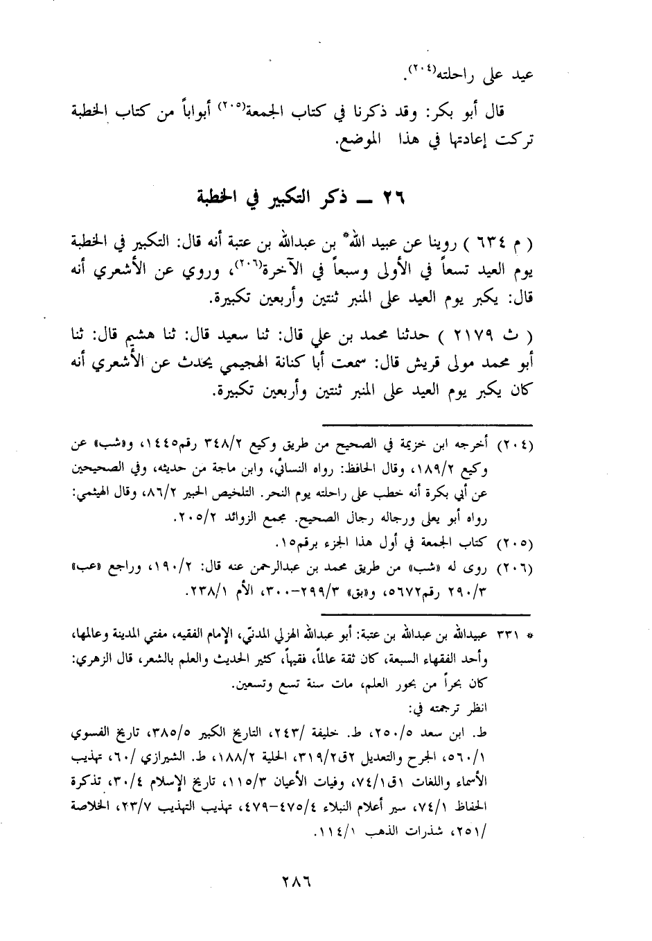 ذِكْرُ التَّكْبِيرِ فِي الْخُطْبَةِ رُوِّينَا عَنْ عُبَيْدِ اللهِ بْنِ عَبْدِ اللهِ بْنِ عُتْبَةَ، أَنَّهُ قَالَ: «التَّكْبِيرُ فِي الْخُطْبَةِ يَوْمَ الْعِيدِ تِسْعًا فِي الْأُولَى، وَسَبْعًا فِي الْآخِرَةِ» . وَرُوِيَ عَنِ الْأَشْعَرِيِّ أَنَّهُ قَالَ: «يُكَبِّرُ يَوْمَ الْعِيدِ عَلَى الْمِنْبَرِ ثِنْتَيْنِ وَأَرْبَعِينَ تَكْبِيرَةً»
