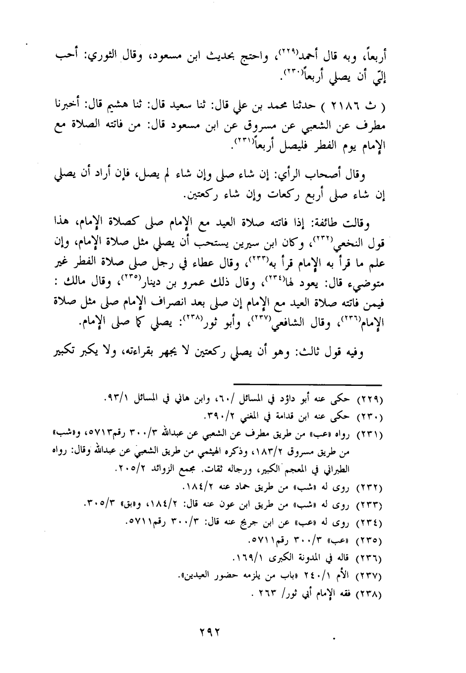 2186 - حَدَّثَنَا مُحَمَّدُ بْنُ عَلِيٍّ، قَالَ: ثنا سَعِيدٌ، قَالَ: ثنا هُشَيْمٌ، قَالَ: أَخْبَرَنَا مُطَرِّفٌ، عَنِ الشَّعْبِيِّ، عَنْ مَسْرُوقٍ، عَنِ ابْنِ مَسْعُودٍ، قَالَ: «مَنْ فَاتَتْهُ الصَّلَاةُ مَعَ الْإِمَامِ يَوْمَ الْفِطْرِ فَلْيُصَلِّ أَرْبَعًا» وَقَالَ أَصْحَابُ الرَّأْيِ: إِنْ شَاءَ صَلَّى وَإِنْ شَاءَ لَمْ يُصَلِّ، فَإِنْ أَرَادَ أَنْ يُصَلِّيَ إِنْ شَاءَ صَلَّى أَرْبَعَ رَكَعَاتٍ وَإِنْ شَاءَ رَكْعَتَيْنِ. وَقَالَتْ طَائِفَةٌ: إِذَا فَاتَتْهُ صَلَاةُ الْعِيدِ مَعَ الْإِمَامِ صَلَّى كَصَلَاةِ الْإِمَامِ، هَذَا قَوْلُ النَّخَعِيِّ وَكَانَ ابْنُ سِيرِينَ يَسْتَحِبُّ أَنْ يُصَلِّيَ مِثْلَ صَلَاةِ الْإِمَامِ، وَإِنْ عَلِمَ مَا قَرَأَ الْإِمَامُ قَرَأَ بِهِ، وَقَالَ عَطَاءٌ فِي رَجُلٍ صَلَّى صَلَاةَ الْفِطْرِ غَيْرَ مُتَوَضِّئٍ قَالَ: يَعُودُ لَهَا، وَقَالَ ذَلِكَ عَمْرُو بْنُ دِينَارٍ، وَقَالَ مَالِكٌ: فِيمَنْ فَاتَتْهُ صَلَاةُ الْعِيدِ مَعَ الْإِمَامِ: إِنْ صَلَّى بَعْدَ انْصِرَافِ الْإِمَامِ صَلَّى مِثْلَ صَلَاةِ الْإِمَامِ، وَقَالَ الشَّافِعِيُّ، وَأَبُو ثَوْرٍ: يُصَلِّي كَمَا صَلَّى الْإِمَامُ. وَفِيهِ قَوْلٌ ثَالِثٌ: وَهُوَ أَنْ يُصَلِّيَ رَكْعَتَيْنِ لَا يَجْهَرُ بِقِرَاءَتِهِ، وَلَا يُكَبِّرُ تَكْبِيرَ -[293]- الْإِمَامِ، هَذَا قَوْلُ الْأَوْزَاعِيِّ. وَفِيهِ قَوْلٌ رَابِعٌ: وَهُوَ إِنْ صَلَّى فِي الْجَبَّانِ صَلَّى كَمَا صَلَّى الْإِمَامُ، وَإِنْ لَمْ يُصَلِّ فِي الْجَبَّانِ صَلَّى أَرْبَعًا، هَذَا قَوْلُ إِسْحَاقَ. قَالَ أَبُو بَكْرٍ: سَنَّ رَسُولُ اللهِ صَلَّى اللَّهُ عَلَيْهِ وَسَلَّمَ صَلَاةَ الْعِيدِ رَكْعَتَيْنِ، فَكُلُّ مَنْ صَلَّى صَلَاةَ الْعِيدِ صَلَّاهَا كَمَا سَنَّهَا النَّبِيُّ صَلَّى اللَّهُ عَلَيْهِ وَسَلَّمَ، وَلَا تَجُوزُ الزِّيَادَةُ فِي عَدَدِ الصَّلَاةِ لِمَنْ فَاتَهُ الْعِيدُ بِغَيْرِ حُجَّةٍ، وَلَا أَحْسَبُ خَبَرَ ابْنِ مَسْعُودٍ يَثْبُتُ، لِأَنَّ الَّذِي رَوَاهُ مُطَرِّفٌ عَنِ الشَّعْبِيِّ