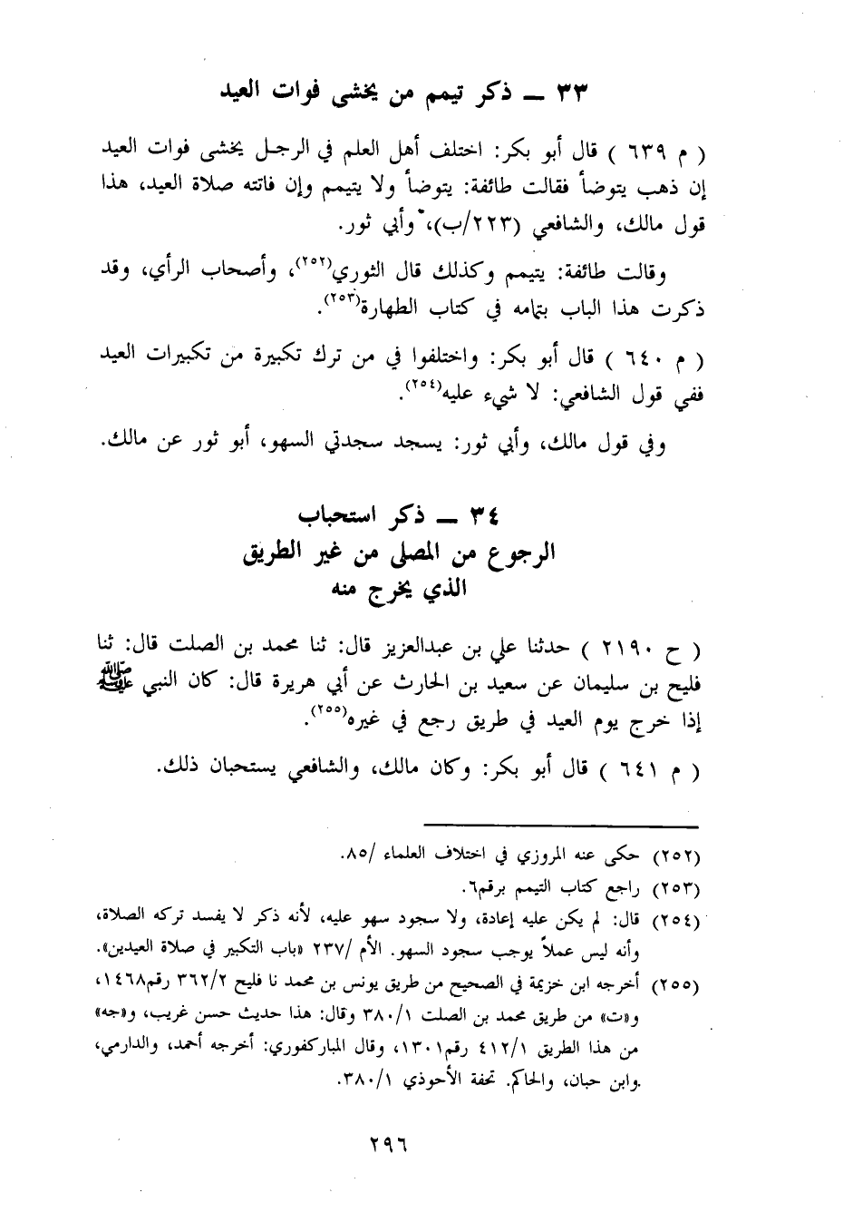 ذِكْرُ تَيَمُّمِ مَنْ يَخْشَى فَوَاتِ الْعِيدِ قَالَ أَبُو بَكْرٍ: اخْتَلَفَ أَهْلُ الْعِلْمِ فِي الرَّجُلِ يَخْشَى فَوَاتَ الْعِيدِ إِنْ ذَهَبَ يَتَوَضَّأُ فَقَالَتْ طَائِفَةٌ: يَتَوَضَّأُ وَلَا يَتَيَمَّمُ وَإِنْ فَاتَتْهُ صَلَاةُ الْعِيدِ، هَذَا قَوْلُ مَالِكٍ، وَالشَّافِعِيِّ، وَأَبِي ثَوْرٍ. وَقَالَتْ طَائِفَةٌ: يَتَيَمَّمُ، وَكَذَلِكَ قَالَ الثَّوْرِيُّ، وَأَصْحَابُ الرَّأْيِ، وَقَدْ ذَكَرْتُ هَذَا الْبَابَ بِتَمَامِهِ فِي كِتَابِ الطَّهَارَةِ. قَالَ أَبُو بَكْرٍ: وَاخْتَلَفُوا فِي مَنْ تَرْكِ تَكْبِيرَةٍ مِنْ تَكْبِيرَاتِ الْعِيدِ، فَفِي قَوْلِ الشَّافِعِيِّ: لَا شَيْءَ عَلَيْهِ. وَفِي قَوْلِ مَالِكٍ، وَأَبِي ثَوْرٍ: يَسْجُدُ سَجْدَتَيِ السَّهْوِ، أَبُو ثَوْرٍ عَنْ مَالِكٍ