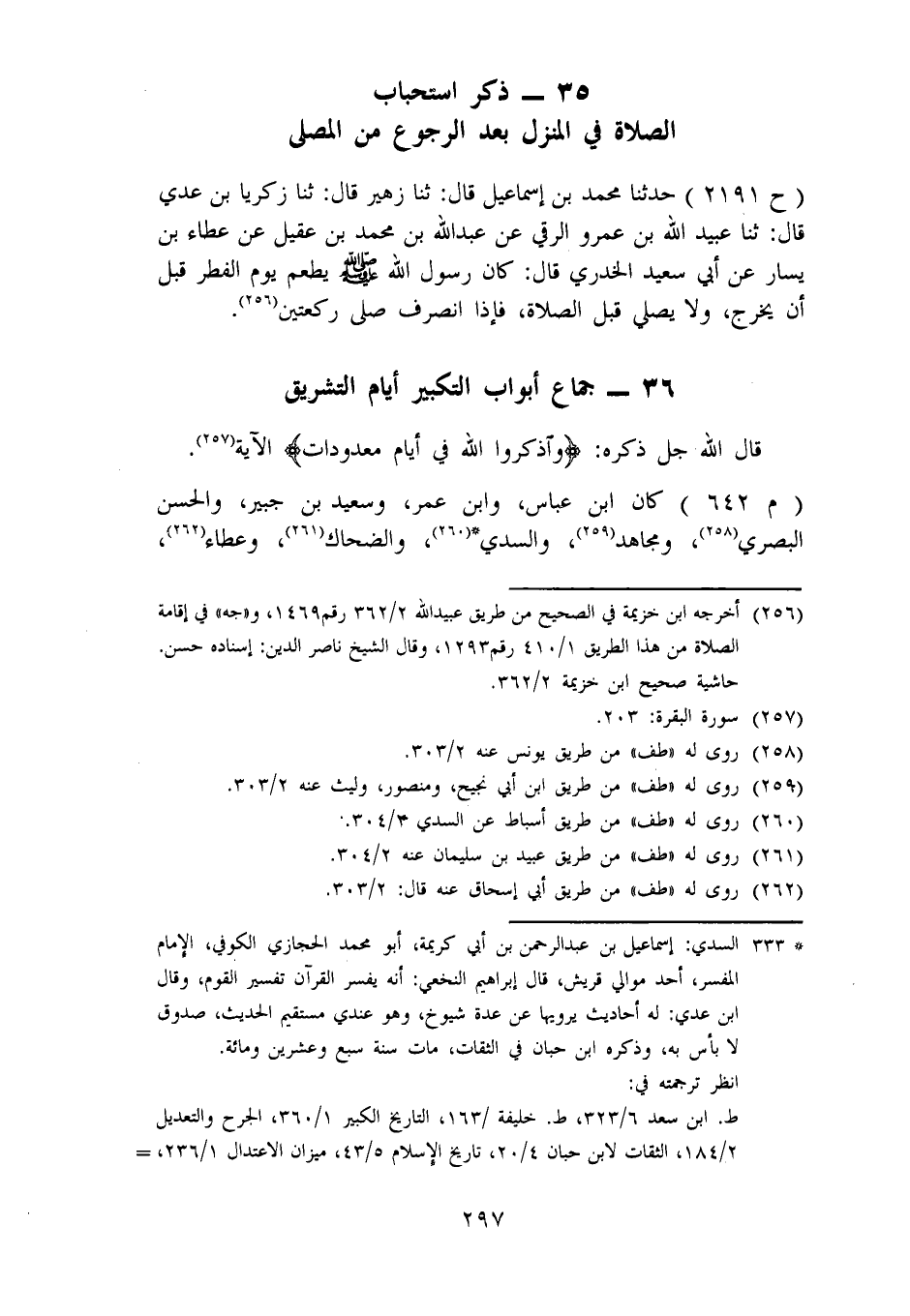 جِمَاعُ أَبْوَابِ التَّكْبِيرِ أَيَّامَ التَّشْرِيقِ قَالَ اللهُ جَلَّ ذِكْرُهُ: {وَاذْكُرُوا اللهَ فِي أَيَّامٍ مَعْدُودَاتٍ} [البقرة: 203] الْآيَةَ. كَانَ ابْنُ عَبَّاسٍ، وَابْنُ عُمَرَ، وَسَعِيدُ بْنُ جُبَيْرٍ، وَالْحَسَنُ الْبَصْرِيُّ، وَمُجَاهِدٌ، وَالسُّدِّيُّ، وَالضَّحَّاكُ، وَعَطَاءٌ , -[298]- وَقَتَادَةُ يَقُولُونَ فِي قَوْلِهِ: {وَاذْكُرُوا اللهَ فِي أَيَّامٍ مَعْدُودَاتٍ} [البقرة: 203] الْآيَةَ: أَنَّهَا أَيَّامُ التَّشْرِيقِ.
