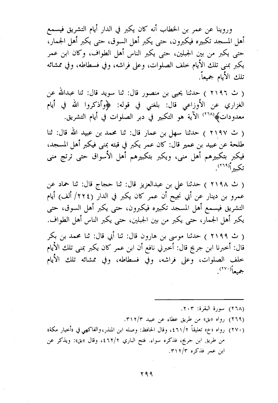 2199 - حَدَّثَنَا مُوسَى بْنُ هَارُونَ، قَالَ: ثنا أَبِي قَالَ: ثنا مُحَمَّدُ بْنُ بَكْرٍ، قَالَ: أَخْبَرَنَا ابْنُ جُرَيْجٍ، قَالَ: أَخْبَرَنِي نَافِعٌ، أَنَّ ابْنَ عُمَرَ: «كَانَ يُكَبِّرُ بِمِنًي تِلْكَ الْأَيَّامَ خَلْفَ الصَّلَوَاتِ، وَعَلَى فِرَاشِهِ، وَفِي فُسْطَاطِهِ، وَفِي مَمْشَائِهِ تِلْكَ الْأَيَّامَ جَمِيعًا»