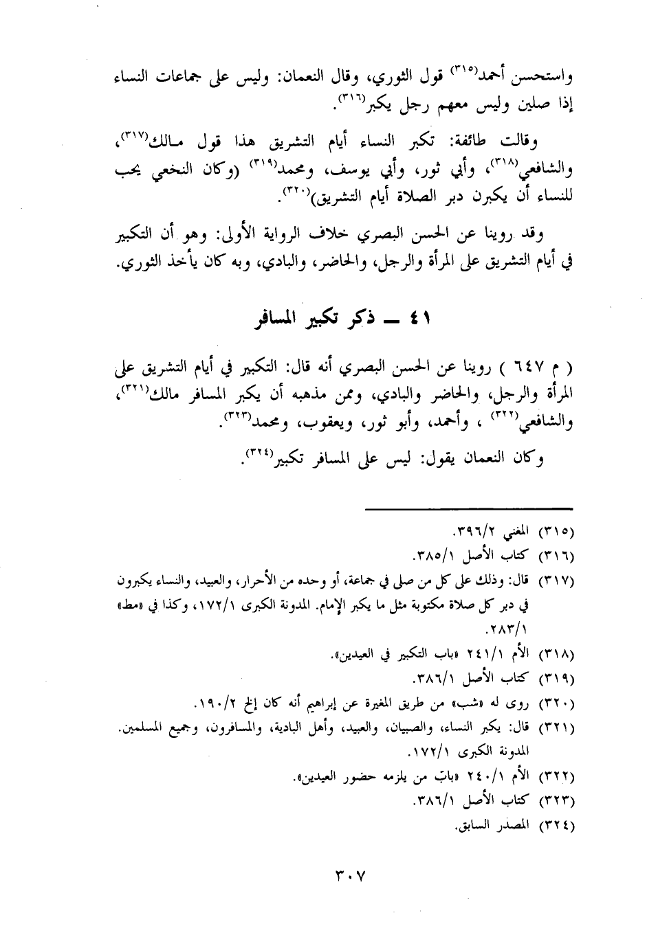 ذِكْرُ تَكْبِيرِ الْمُسَافِرِ رُوِّينَا عَنِ الْحَسَنِ الْبَصْرِيِّ، أَنَّهُ قَالَ: «التَّكْبِيرُ فِي أَيَّامِ التَّشْرِيقِ عَلَى الْمَرْأَةِ وَالرَّجُلِ، وَالْحَاضِرِ، وَالْبَادِي» ، وَمِمَّنْ مَذْهَبُهُ أَنْ يُكَبِّرَ الْمُسَافِرُ: مَالِكٌ، وَالشَّافِعِيُّ، وَأَحْمَدُ، وَأَبُو ثَوْرٍ، وَيَعْقُوبُ، وَمُحَمَّدٌ. وَكَانَ النُّعْمَانُ يَقُولُ: لَيْسَ عَلَى الْمُسَافِرِ تَكْبِيرٌ