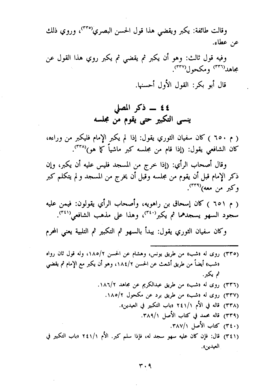 ذِكْرُ الْمُصَلِّي يَنْسَى التَّكْبِيرَ حَتَّى يَقُومَ مِنْ مَجْلِسِهِ كَانَ سُفْيَانُ الثَّوْرِيُّ يَقُولُ: إِذَا لَمْ يُكَبِّرِ الْإِمَامُ فَلْيُكَبِّرْ مَنْ وَرَاءَهُ، كَانَ الشَّافِعِيُّ يَقُولُ: إِذَا قَامَ مِنْ مَجْلِسِهِ كَبَّرَ مَاشِيًا كَمَا هُوَ. وَقَالَ أَصْحَابُ الرَّأْيِ: إِذَا خَرَجَ مِنَ الْمَسْجِدِ فَلَيْسَ عَلَيْهِ أَنْ يُكَبِّرَ، وَإِنْ ذَكَرَ الْإِمَامَ قَبْلَ أَنْ يَقُومَ مِنْ مَجْلِسِهِ وَقَبْلَ أَنْ يَخْرُجَ مِنَ الْمَسْجِدِ وَلَمْ يَتَكَلَّمْ كَبَّرَ وَكَبَّرَ مَنْ مَعَهُ. كَانَ إِسْحَاقُ بْنُ رَاهَوَيْهِ، وَأَصْحَابُ الرَّأْيِ يَقُولُونَ فِيمَنْ عَلَيْهِ سُجُودُ السَّهْوِ: يَسْجُدُهُمَا ثُمَّ يُكَبِّرُ، وَهَذَا عَلَى مَذْهَبِ الشَّافِعِيِّ. وَكَانَ سُفْيَانُ الثَّوْرِيُّ يَقُولُ: يَبْدَأُ بِالسَّهْوِ ثُمَّ التَّكْبِيرِ ثُمَّ التَّلْبِيَةِ يَعْنِي الْمُحْرِمَ
