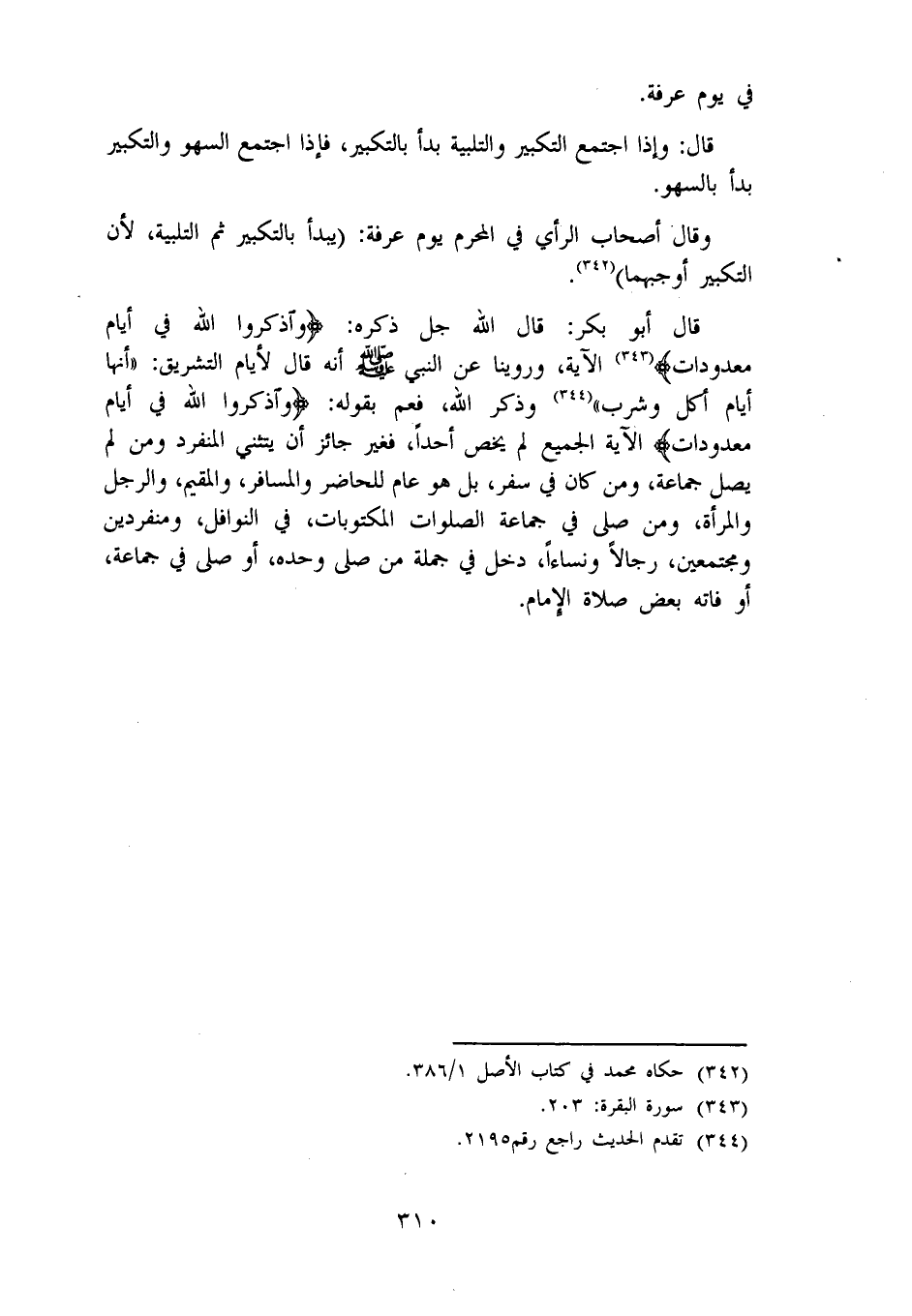 فِي يَوْمِ عَرَفَةَ. قَالَ: وَإِذَا اجْتَمَعَ التَّكْبِيرُ وَالتَّلْبِيَةُ بَدَأَ بِالتَّكْبِيرِ، فَإِذَا اجْتَمَعَ السَّهْوُ وَالتَّكْبِيرُ بَدَأَ بِالسَّهْوِ. وَقَالَ أَصْحَابُ الرَّأْيِ فِي الْمُحْرِمِ يَوْمَ عَرَفَةَ: يَبْدَأُ بِالتَّكْبِيرِ ثُمَّ التَّلْبِيَةِ، لِأَنَّ التَّكْبِيرَ أَوْجَبَهُمَا. قَالَ أَبُو بَكْرٍ: قَالَ اللهُ جَلَّ ذَكَرَهُ: {وَاذْكُرُوا اللهَ فِي أَيَّامٍ مَعْدُودَاتٍ} [البقرة: 203] الْآيَةَ، وَرُوِّينَا عَنِ النَّبِيِّ صَلَّى اللَّهُ عَلَيْهِ وَسَلَّمَ أَنَّهُ قَالَ لِأَيَّامِ التَّشْرِيقِ: «إِنَّهَا أَيَّامُ أَكْلٍ وَشُرْبٍ وَذِكْرِ اللهِ» فَعَمَّ بِقَوْلِهِ: {وَاذْكُرُوا اللهَ فِي أَيَّامٍ مَعْدُودَاتٍ} [البقرة: 203] الْآيَةِ الْجَمِيعَ لَمْ يَخُصَّ أَحَدًا فَغَيْرُ جَائِزٍ أَنْ يَسْتَثْنِيَ الْمُنْفَرِدَ وَمَنْ لَمْ يُصَلِّ جَمَاعَةً، وَمَنْ كَانَ فِي سَفَرٍ، بَلْ هُوَ عَامٌّ لِلْحَاضِرِ وَالْمُسَافِرِ، وَالْمُقِيمِ، وَالرَّجُلِ وَالْمَرْأَةِ، وَمَنْ صَلَّى فِي جَمَاعَةٍ الصَّلَوَاتِ الْمَكْتُوبَاتِ، وَفِي النَّوَافِلِ، وَمُنْفَرِدِينَ وَمُجْتَمِعِينَ، رِجَالًا وَنِسَاءً، دَخَلَ فِي جُمْلَةِ مَنْ صَلَّى وَحْدَهُ، أَوْ صَلَّى فِي جَمَاعَةٍ، أَوْ فَاتَهُ بَعْضُ صَلَاةِ الْإِمَامِ