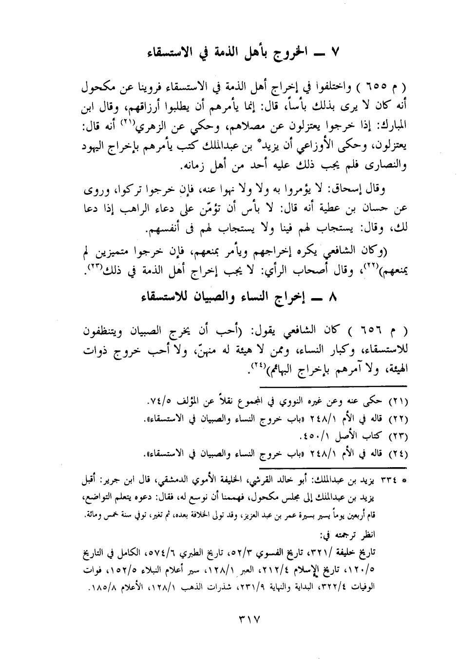 الْخُرُوجُ بِأَهْلِ الذِّمَّةِ فِي الِاسْتِسْقَاءِ وَاخْتَلَفُوا فِي إِخْرَاجِ أَهْلِ الذِّمَّةِ فِي الِاسْتِسْقَاءِ، فَرُوِّينَا عَنْ مَكْحُولٍ أَنَّهُ كَانَ لَا يَرَى بِذَلِكَ بَأْسًا، قَالَ: إِنَّمَا يَأْمُرُهُمْ أَنْ يَطْلُبُوا أَرْزَاقَهُمْ، وَقَالَ ابْنُ الْمُبَارَكِ: إِذَا خَرَجُوا يَعْتَزِلُونَ عَنْ مُصَلَّاهُمْ، وَحُكِيَ عَنِ الزُّهْرِيِّ أَنَّهُ قَالَ: يَعْتَزِلُونَ، وَحَكَى الْأَوْزَاعِيُّ أَنَّ يَزِيدَ بْنِ عَبْدِ الْمَلِكِ كَتَبَ يَأْمُرُهُمْ بِإِخْرَاجِ الْيَهُودِ وَالنَّصَارَى فَلَمْ يُجِبْ ذَلِكَ عَلَيْهِ مِنْ أَهْلِ زَمَانِهِ، وَقَالَ إِسْحَاقُ: لَا يُؤْمَرُوا بِهِ وَلَا نُهُوا عَنْهُ، فَإِنْ خَرَجُوا تُرِكُوا، وَرُوِيَ عَنْ حَسَّانَ بْنِ عَطِيَّةَ أَنَّهُ قَالَ: لَا بَأْسَ أَنْ تُؤَمِّنَ عَلَى دُعَاءِ الرَّاهِبِ إِذَا دَعَا لَكَ وَقَالَ: يُسْتَجَابُ لَهُمْ فِينَا، وَلَا يُسْتَجَابُ لَهُمْ فِي أَنْفُسِهِمْ. وَكَانَ الشَّافِعِيُّ يَكْرَهُ إِخْرَاجَهُمْ وَيَأْمُرُ بِمَنْعِهِمْ، فَإِنْ خَرَجُوا مُتَمَيِّزِينَ لَمْ يَمْنَعُهُمْ، وَقَالَ أَصْحَابُ الرَّأْيِ: لَا يَجِبُ إِخْرَاجُ أَهْلِ الذِّمَّةِ فِي ذَلِكَ