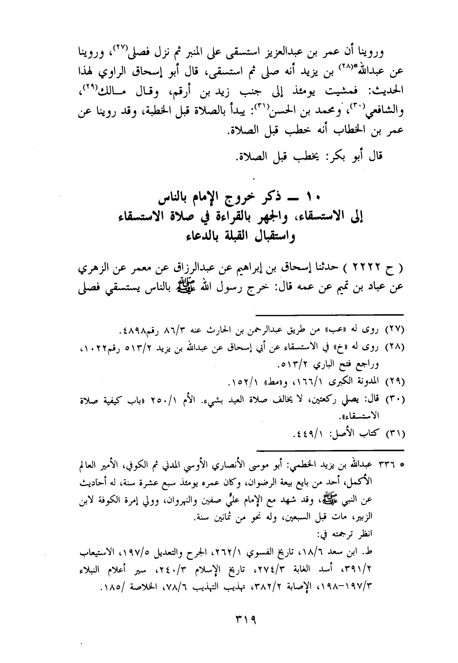 2222 - حَدَّثَنَا إِسْحَاقُ بْنُ إِبْرَاهِيمَ، عَنْ عَبْدِ الرَّزَّاقِ، عَنْ مَعْمَرٍ، عَنِ الزُّهْرِيِّ، عَنْ عَبَّادِ بْنِ تَمِيمٍ، عَنْ عَمِّهِ، قَالَ: «خَرَجَ رَسُولُ اللهِ صَلَّى اللَّهُ عَلَيْهِ وَسَلَّمَ بِالنَّاسِ يَسْتَسْقِي فَصَلَّى -[320]- بِهِمْ رَكْعَتَيْنِ، جَهَرَ بِالْقِرَاءَةِ فِيهِمَا، وَحَوَّلَ رِدَاءَهُ، وَدَعَا وَاسْتَقْبَلَ الْقِبْلَةَ» . وَكَانَ مَالِكُ بْنُ أَنَسٍ، وَالشَّافِعِيُّ، وَأَحْمَدُ، وَأَبُو ثَوْرٍ وَمُحَمَّدُ بْنُ الْحَسَنِ يَقُولُونَ: يَجْهَرُ بِالْقِرَاءَةِ. قَالَ أَبُو بَكْرٍ: وَفِي قَوْلِ ابْنِ عَبَّاسٍ: «وَصَلَّى كَمَا يُصَلِّي فِي الْعِيدِ» ، دَلِيلٌ عَلَى أَنَّ النَّبِيَّ صَلَّى اللَّهُ عَلَيْهِ وَسَلَّمَ كَانَ يَجْهَرُ بِالْقِرَاءَةِ فِي صَلَاةِ الِاسْتِسْقَاءِ