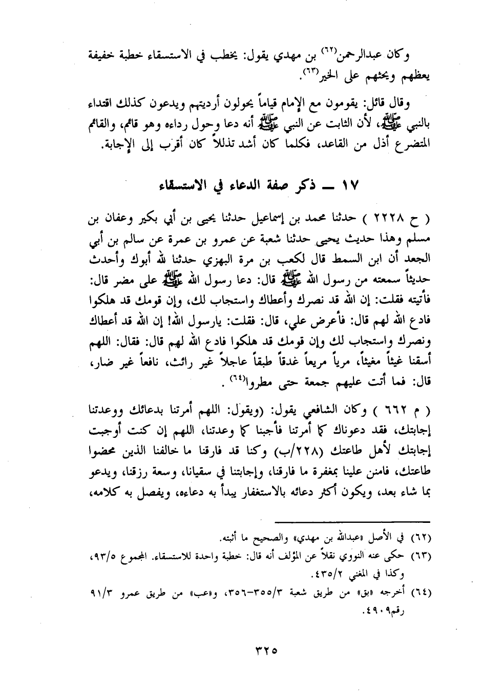 وَكَانَ عَبْدُ الرَّحْمَنِ بْنُ مَهْدِيٍّ يَقُولُ: يَخْطُبُ فِي الِاسْتِسْقَاءِ خُطْبَةً خَفِيفَةً يَعِظُهُمْ وَيَحَثُّهُمْ عَلَى الْخَيْرِ. وَقَالَ قَائِلٌ: يَقُومُونَ مَعَ الْإِمَامِ قِيَامًا يُحَوِّلُونَ أَرْدِيَتَهُمْ وَيَدْعُونَ كَذَلِكَ اقْتِدَاءً بِالنَّبِيِّ صَلَّى اللَّهُ عَلَيْهِ وَسَلَّمَ، لِأَنَّ الثَّابِتَ عَنِ النَّبِيِّ صَلَّى اللَّهُ عَلَيْهِ وَسَلَّمَ أَنَّهُ دَعَا وَحَوَّلَ رِدَاءَهُ وَهُوَ قَائِمٌ، وَالْقَائِمُ الْمُتَضَرِّعُ أَذَلُّ مِنَ الْقَاعِدِ، فَكُلَّمَا كَانَ أَشَدَّ تَذَلُّلًا كَانَ أَقْرَبَ إِلَى الْإِجَابَةِ