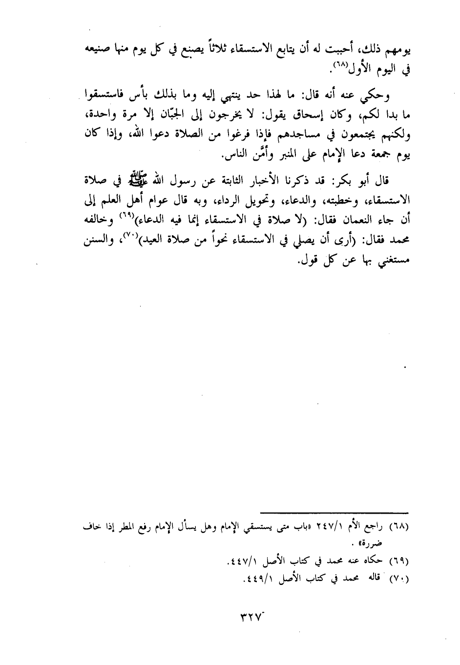 يَوْمَهُمْ ذَلِكَ، أَحْبَبْتُ لَهُ أَنْ يُتَابِعَ الِاسْتِسْقَاءَ ثَلَاثًا يَصْنَعُ فِي كُلِّ يَوْمٍ مِنْهَا صَنِيعَهُ فِي الْيَوْمِ الْأَوَّلِ. وَحُكِيَ عَنْهُ أَنَّهُ قَالَ: مَا لِهَذَا حَدٌّ يُنْتَهَى إِلَيْهِ وَمَا بِذَلِكَ بَأْسٌ فَاسْتَسْقُوا مَا بَدَا لَكُمْ، وَكَانَ إِسْحَاقُ يَقُولُ: لَا يَخْرُجُونَ إِلَى الْجَبَّانِ إِلَّا مَرَّةً وَاحِدَةً وَلَكِنَّهُمْ يَجْتَمِعُونَ فِي مَسَاجِدِهِمْ، فَإِذَا فَرَغُوا مِنَ الصَّلَاةِ دَعَوَا اللهَ، وَإِذَا كَانَ يَوْمُ جُمُعَةٍ دَعَا الْإِمَامُ عَلَى الْمِنْبَرِ وَأَمَّنَ النَّاسُ. قَالَ أَبُو بَكْرٍ: قَدْ ذَكَرْنَا الْأَخْبَارَ الثَّابِتَةَ عَنْ رَسُولِ اللهِ صَلَّى اللَّهُ عَلَيْهِ وَسَلَّمَ فِي صَلَاةِ الِاسْتِسْقَاءِ وَخُطْبَتِهِ، وَالدُّعَاءِ، وَتَحْوِيلِ الرِّدَاءِ، وَبِهِ قَالَ عَوَّامُّ أَهْلِ الْعِلْمِ إِلَى أَنْ جَاءَ النُّعْمَانُ فَقَالَ: لَا صَلَاةَ فِي الِاسْتِسْقَاءِ، إِنَّمَا فِيهِ الدُّعَاءُ. وَخَالَفَهُ مُحَمَّدٌ فَقَالَ: أَرَى أَنْ يُصَلِّيَ فِي الِاسْتِسْقَاءِ نَحْوًا مِنْ صَلَاةِ الْعِيدِ. وَالسُّنَنُ مُسْتَغْنًى بِهَا عَنْ كُلِّ قَوْلٍ