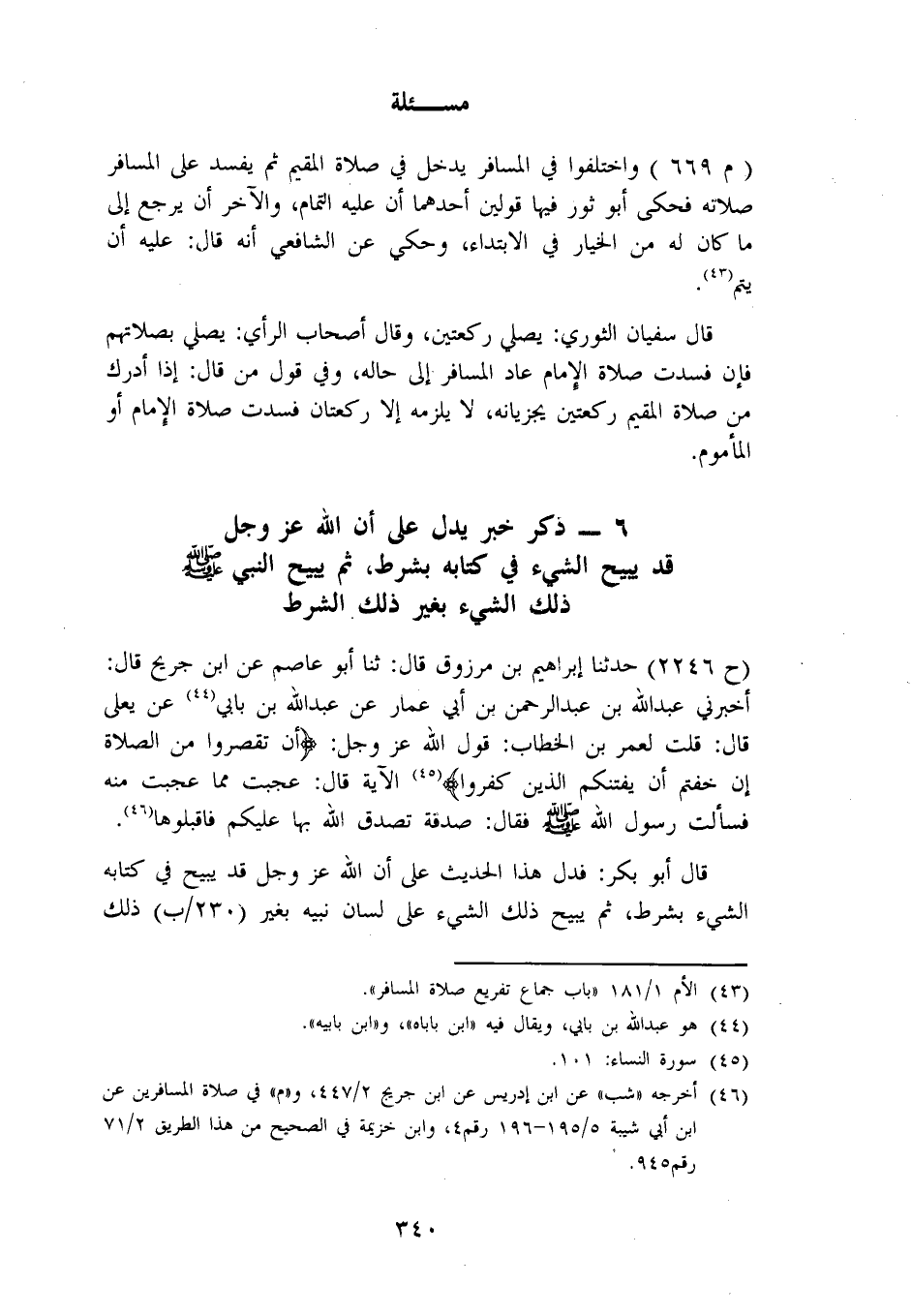 2246 - حَدَّثَنَا إِبْرَاهِيمُ بْنُ مَرْزُوقٍ، قَالَ: ثنا أَبُو عَاصِمٍ، عَنِ ابْنِ جُرَيْجٍ، قَالَ: أَخْبَرَنِي عَبْدُ اللهِ بْنُ عَبْدِ الرَّحْمَنِ بْنِ أَبِي عَمَّارٍ، عَنْ عَبْدِ اللهِ بْنِ بَابِي، عَنْ يَعْلَى قَالَ: قُلْتُ لِعُمَرَ بْنِ الْخَطَّابِ: قَوْلُ اللهِ عَزَّ وَجَلَّ: {أَنْ تَقْصُرُوا} [النساء: 101] مِنَ الصَّلَاةِ إِنْ خِفْتُمْ أَنْ يَفْتِنَكُمُ الَّذِينَ كَفَرُوا الْآَيَةَ، قَالَ: عَجِبْتُ مِمَّا عَجِبْتَ مِنْهُ، فَسَأَلْتُ رَسُولَ اللهِ صَلَّى اللَّهُ عَلَيْهِ وَسَلَّمَ، فَقَالَ: «صَدَقَةٌ تَصَدَّقَ اللهُ بِهَا عَلَيْكُمْ فَاقْبَلُوهَا» قَالَ أَبُو بَكْرٍ: فَدَلَّ هَذَا الْحَدِيثُ عَلَى أَنَّ اللهَ عَزَّ وَجَلَّ قَدْ يُبِيحُ فِي كِتَابِهِ الشَّيْءَ بِشَرْطٍ، ثُمَّ يُبِيحُ ذَلِكَ الشَّيْءَ عَلَى لِسَانِ نَبِيِّهِ بِغَيْرِ ذَلِكَ -[341]- الشَّرْطِ، أَلَا تَرَى أَنَّ الْقَصْرَ إِنَّمَا أُبِيحَ عَلَى ظَاهِرِ الْكِتَابِ لِمَنْ كَانَ خَائِفًا، فَلَمَّا أَبَاحَ النَّبِيُّ صَلَّى اللَّهُ عَلَيْهِ وَسَلَّمَ الْقَصْرَ فِي حَالِ الْأَمْنِ كَانَتِ الْإِبَاحَةُ فِي الْقَصْرِ قَائِمَةً فِي حَالِ الْخَوْفِ بِكِتَابِ اللهِ، وَفِي حَالِ الْأَمْنِ بِالْأَخْبَارِ الثَّابِتَةِ عَنْ نَبِيِّ اللهِ صَلَّى اللَّهُ عَلَيْهِ وَسَلَّمَ