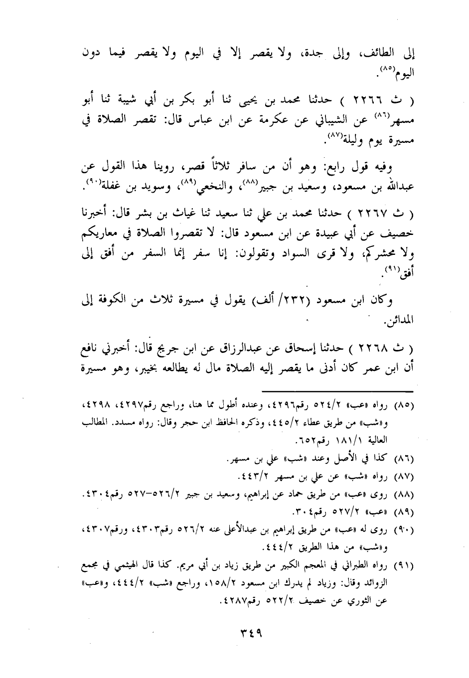 2266 - حَدَّثَنَا مُحَمَّدُ بْنُ يَحْيَى، ثنا أَبُو بَكْرِ بْنُ أَبِي شَيْبَةَ، ثنا أَبُو مُسْهِرٍ، عَنِ الشَّيْبَانِيِّ، عَنْ عِكْرِمَةَ، عَنِ ابْنِ عَبَّاسٍ، قَالَ: «تُقْصَرُ الصَّلَاةُ فِي مَسِيرَةِ يَوْمٍ وَلَيْلَةٍ» وَفِيهِ قَوْلٌ رَابِعٌ: وَهُوَ أَنَّ مَنَ سَافَرَ ثَلَاثًا قَصَرَ، رُوِّينَا هَذَا الْقَوْلُ عَنْ عَبْدِ اللهِ بْنِ مَسْعُودٍ، وَسَعِيدِ بْنِ جُبَيْرٍ، وَالنَّخَعِيِّ، وَسُوَيْدِ بْنِ غَفَلَةَ